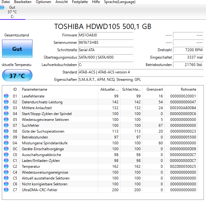HDD / TOSHIBA HDWD 105 500GB I 21759 Betriebsstunden