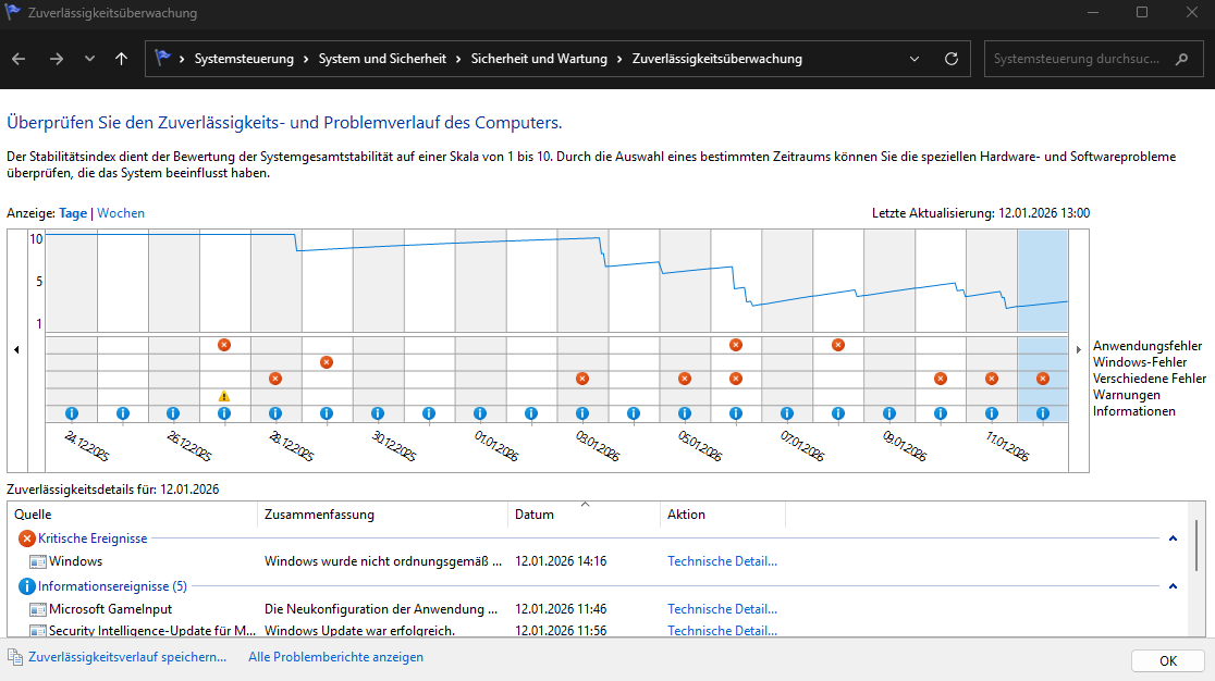 PS: hab den Slot für meine SSD mach gewechselt weil ich dachte vielleicht geht der nicht mehr und hatte Hoffnung, da der PC für zwei Tage nicht abgestürzt ist. Jedoch dann wieder ...Valahdin schrieb:Hallo, mein PC stürzt einfach ab. Hatte 2 Jahre lang kein Problem, aber seit circa 3 Wochen stürzt er fast mehrmals täglich ab; egal ob beim Zocken, oder einfach beim Video schauen. Hab schon wegen Updates geschaut und keine ausstehenden gefunden. Bei der Fehlermeldung steht immer nur: "Windows wurde nicht ordnungsgemäß heruntergefahren" Ich weiß nicht mehr weiter.