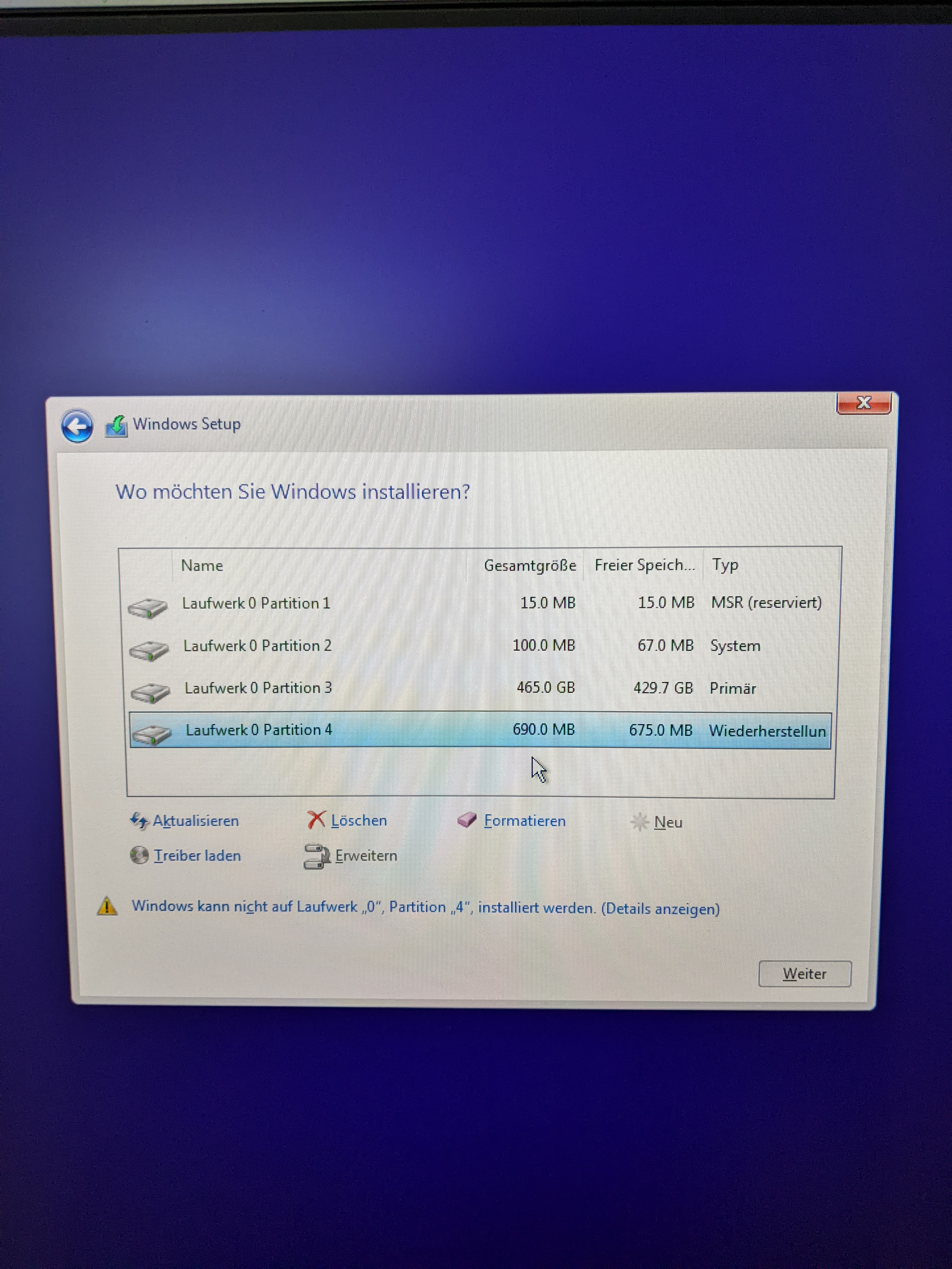 Eben nochmal mit dem Boot-Stick als Startoption eingeschaltet und mir wird erneut der Installationsvorgang angezeigt und folgendes...Portion 3 ist meine Festplatte. Bei Partitionen 1,2 und 4 wird dieselbe Meldung angezeigt (s. Anhang). Seltsamerweise hat die 3 nun über 30gb weniger Speicher, also scheint zuvor was installiert worden zu sein. Was mache ich jetzt am besten, einfach formatieren und die anderen Partionen löschen?