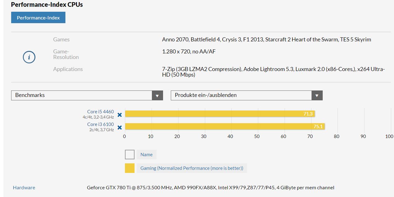 Nicht mal PCGamesHardware verbreitet so einen Müll wie Du, Crebase. Selbst bei niedriger Auflösung und unter Verwendung der schnellen Grafikkarte 780 TI attestieren die dem i3-6100 die höhere Gamingpower gegenüber dem i5-4460:Crebase schrieb:i5-4460 System nehmen, sonst bist Du echt der Narr hinterher.