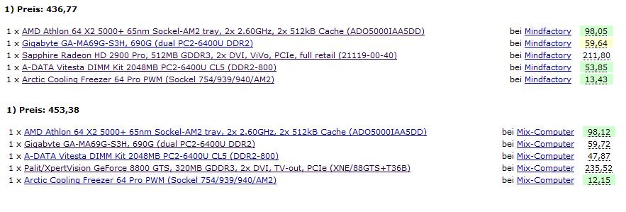 Zusammen für ca. 380,- € einschl. des CPU Kühlers. Hier mit dem kleineren Prozessor, günstigem RAM und einem Board mit neuerem und ebenfalls sehr schnellem Chipsatz von ATI. Dieser bietet allerdings kein Crossfire!
