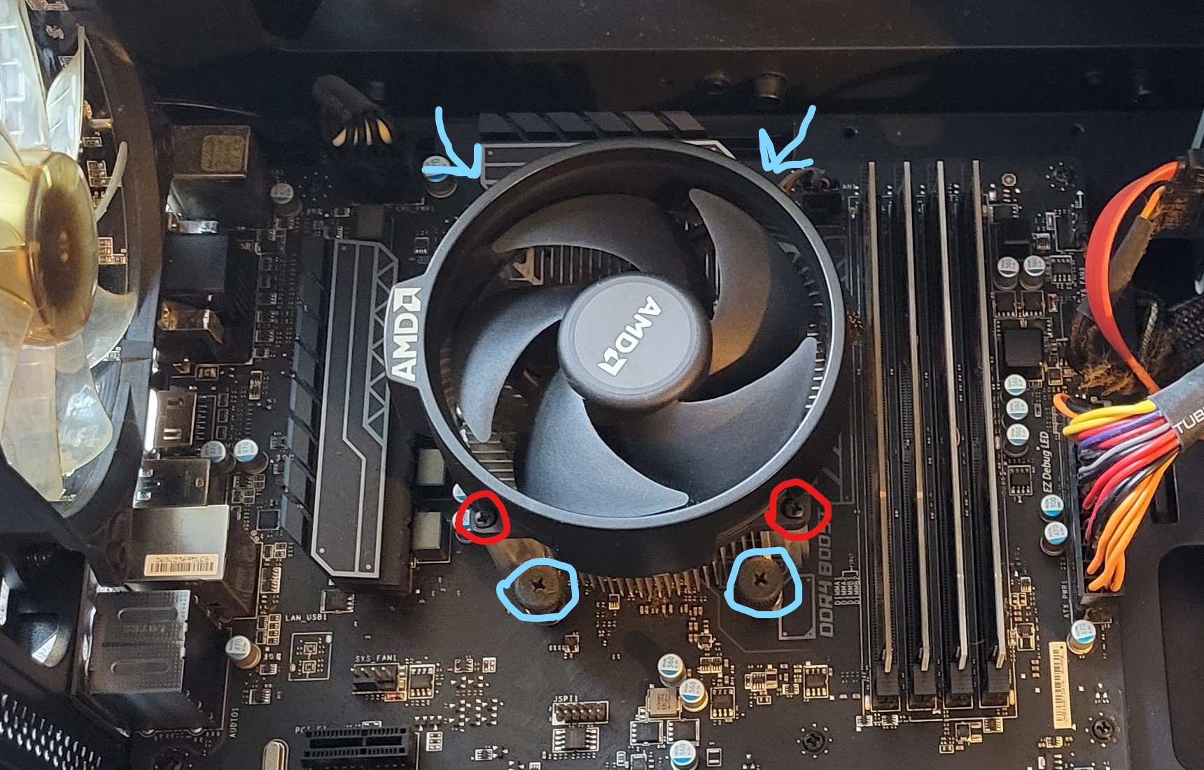An die roten Schrauben bin ich mit dem Schraubendreher erst gar nicht dran gekommen, also hab ich das direkt wieder gelassen. Hätte ich die blauen abgeschraubt, wäre sofort die CPU freigelegt richtig ?
