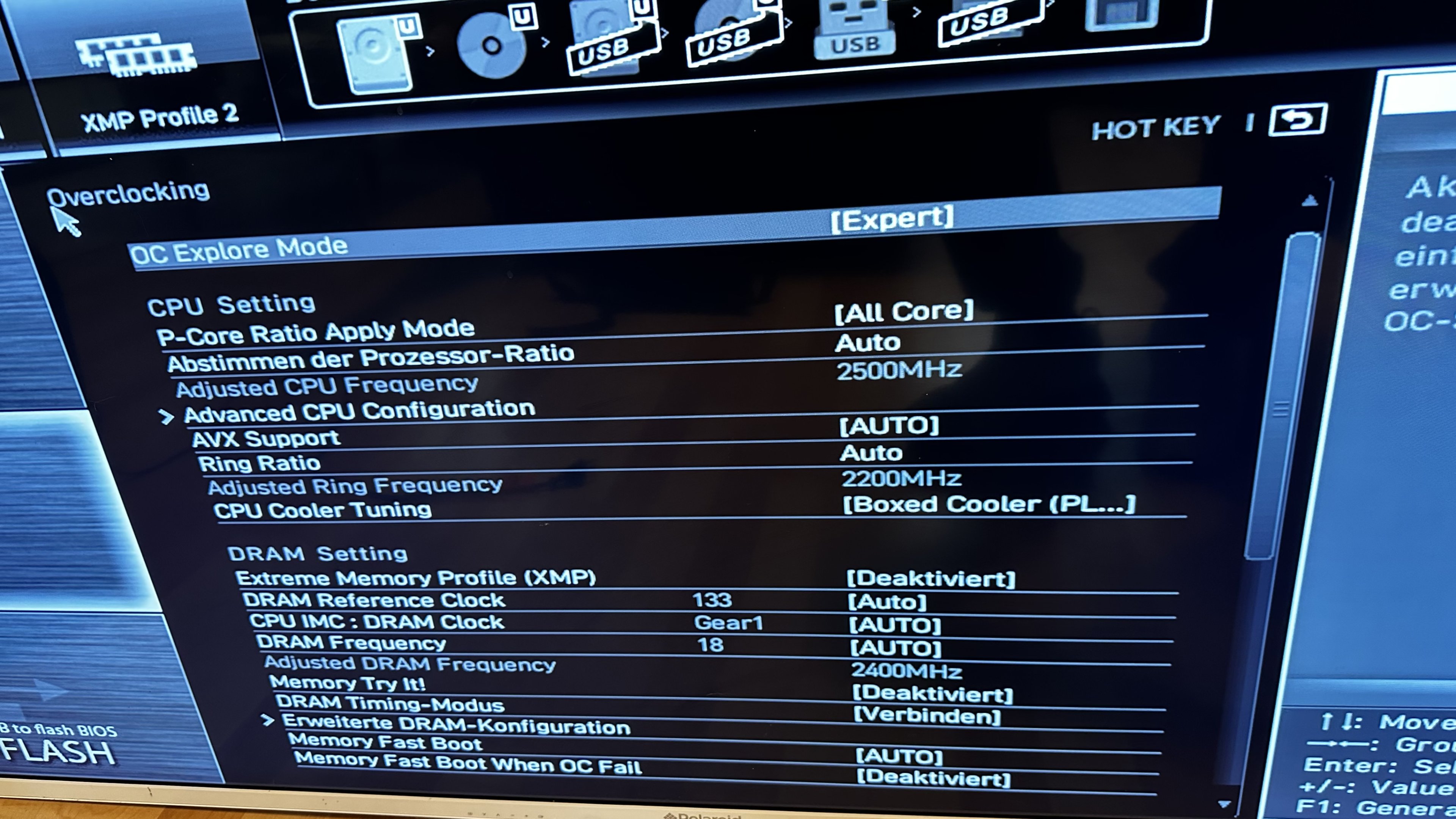 Ich habe selbst wieder das BIOS auf deutsch gestellt und den Expert Modus aktiviert.
