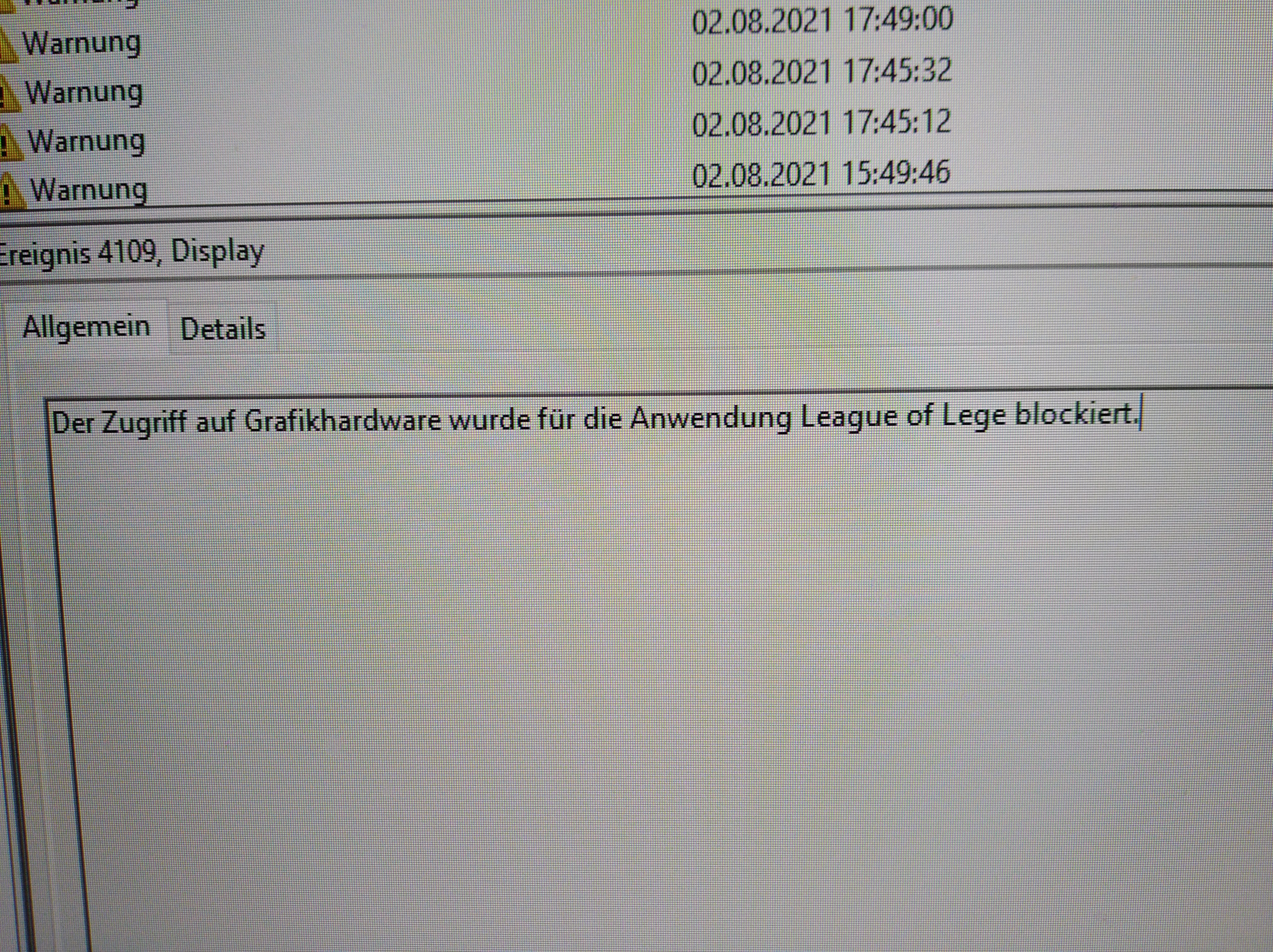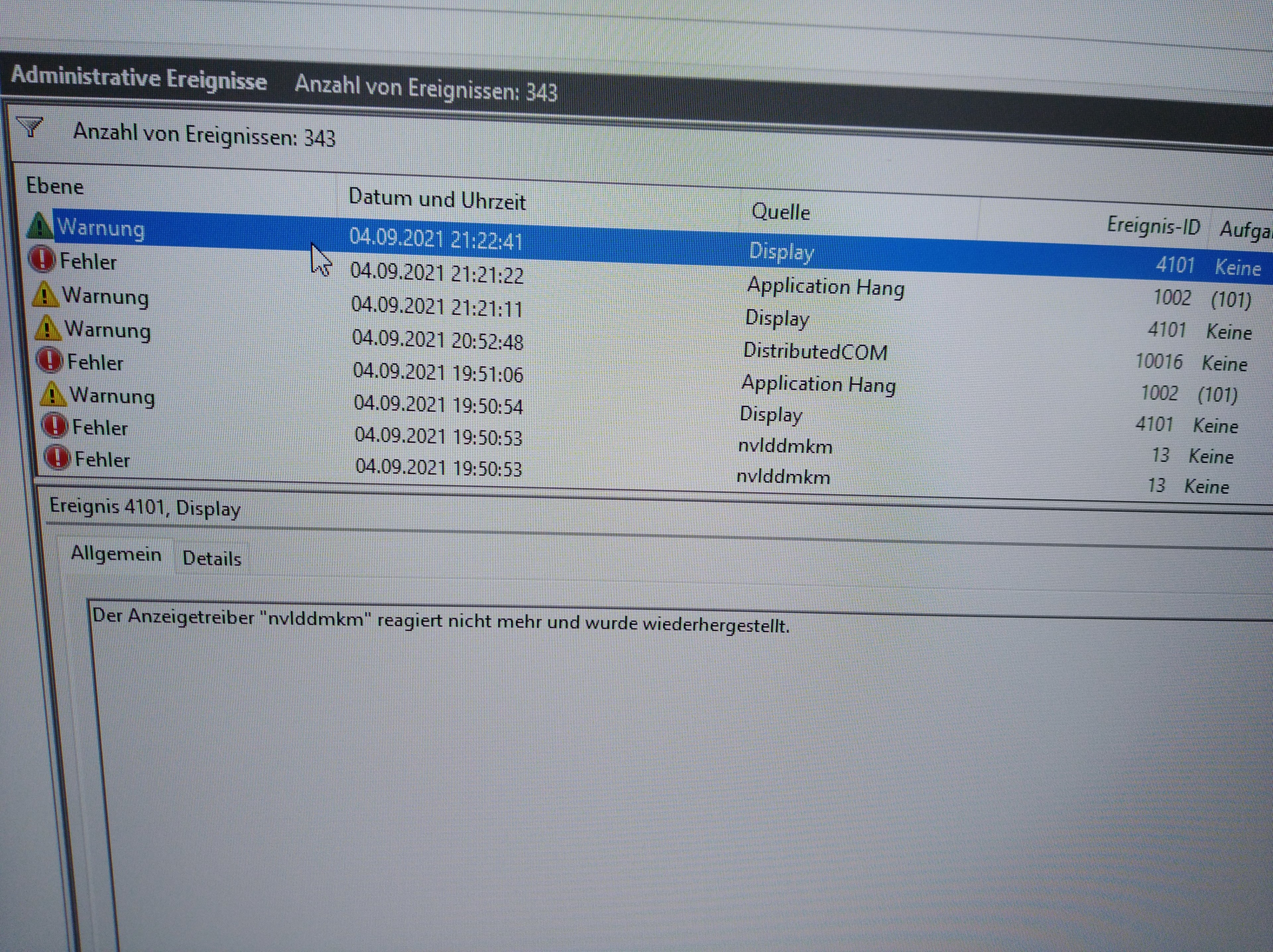...Wenn ich zocke stürzt das Spiel ab. Entweder friert das Bild ein und nach ein paar Sekunden gelange ich wieder automatisch zum Desktop mit folgenden Fehlermeldungen (siehe beigefügte Bilder + davon habe ich gerade kein BIld, aber es wird mir auch mal ein "Dsiplay Adapter" Problem angezeigt). Oder das Spiel fängt an leicht zu ruckeln und wird langsamer und dann haut es mich oft sofort aus dem Spiel. Es gibt Momente da kann ich zb 2h problemlos zocken. Und dann gibt es Momente da kommen die Fehlermeldungen 4x innerhalb von 30 min. Diese Probleme habe ich nur wenn ich zocke. Wenn ich meinen PC für den 'normalen' Gebrauch benutze, funktioniert dieser einwandfrei. Bitte um Hilfe. Danke!