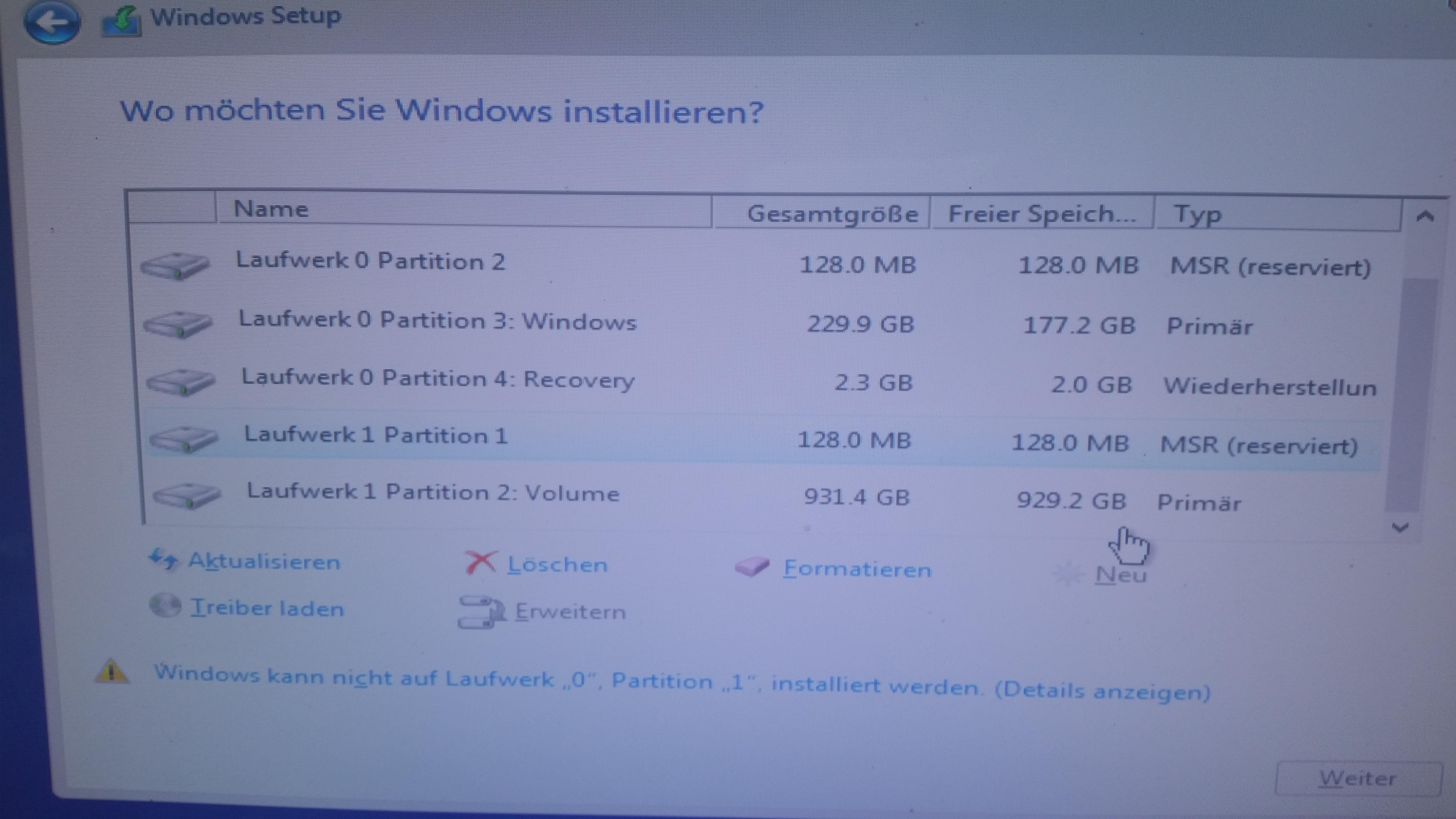 Ok ich bin jetzt hier angekommen. Reine benutzerdefinierte only windows installation. Muss ich bei den Partitionen was beachten?