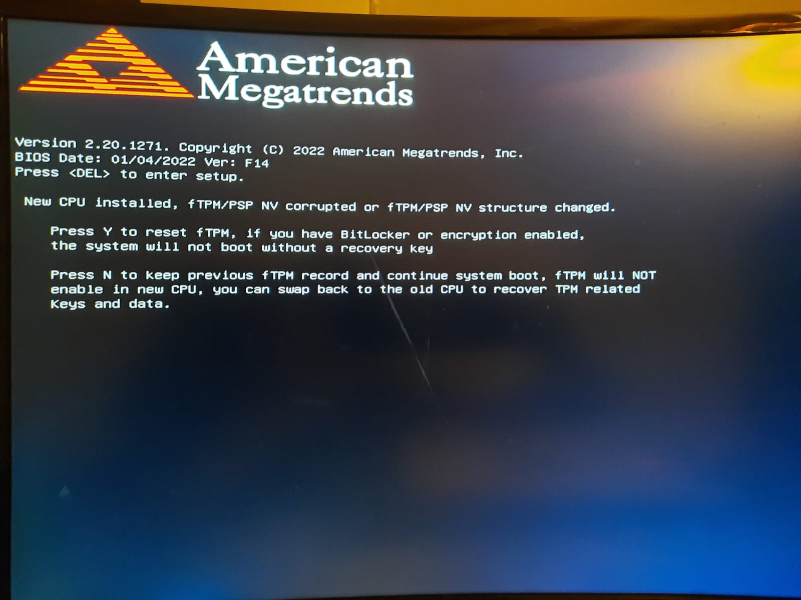 Gestern haben ein Freund und ich seinen PC zusammengebaut (die verbauten Komponenten sind oben angezeigt). Nachdem der PC nicht richtig anging und kein Bild zeigte, stellten wir fest, dass der 24 PIN vom MB nicht richtig am Netzteil steckte. Dann startete der PC richtig und wir wogen uns in Sicherheit. Als ich dann versuchte mit der ENTF Taste ins Bios zu gelangen, passierte nichts. Es tauchte ein Bild mit einer "Fehlermeldung" auf, unten im Anhang zu sehen. "Es wurde eine neue CPU installiert, drücke Y für Reset, N für altes System...". Ich hatte den Windows Stick dann reingeschoben und N gedrückt, dann haben wir uns erstmal nichts dabei gedacht und Windows komplett installiert und eingerichtet. Dann wollte ich mir das nochmal anschauen, wie ich ins Bios komme (z. B. um den Ram auf XMP zu stellen oder Lüfterkurve) und diese Fehlermeldung weggeht. Also drückte ich mal Y, woraufhin dann ein Windows Bluescreen kam, dass auf dem Gerät ein Fehler aufgetreten ist und wir konnten Windows dann nicht mehr starten. Also installierte ich Windows über den Stick und N nochmal neu. Das Ergebnis letztendlich ist, dass der Windows Bluescreen kommt, manchmal dann noch die Starthilfe und die Erweiterten Optionen.