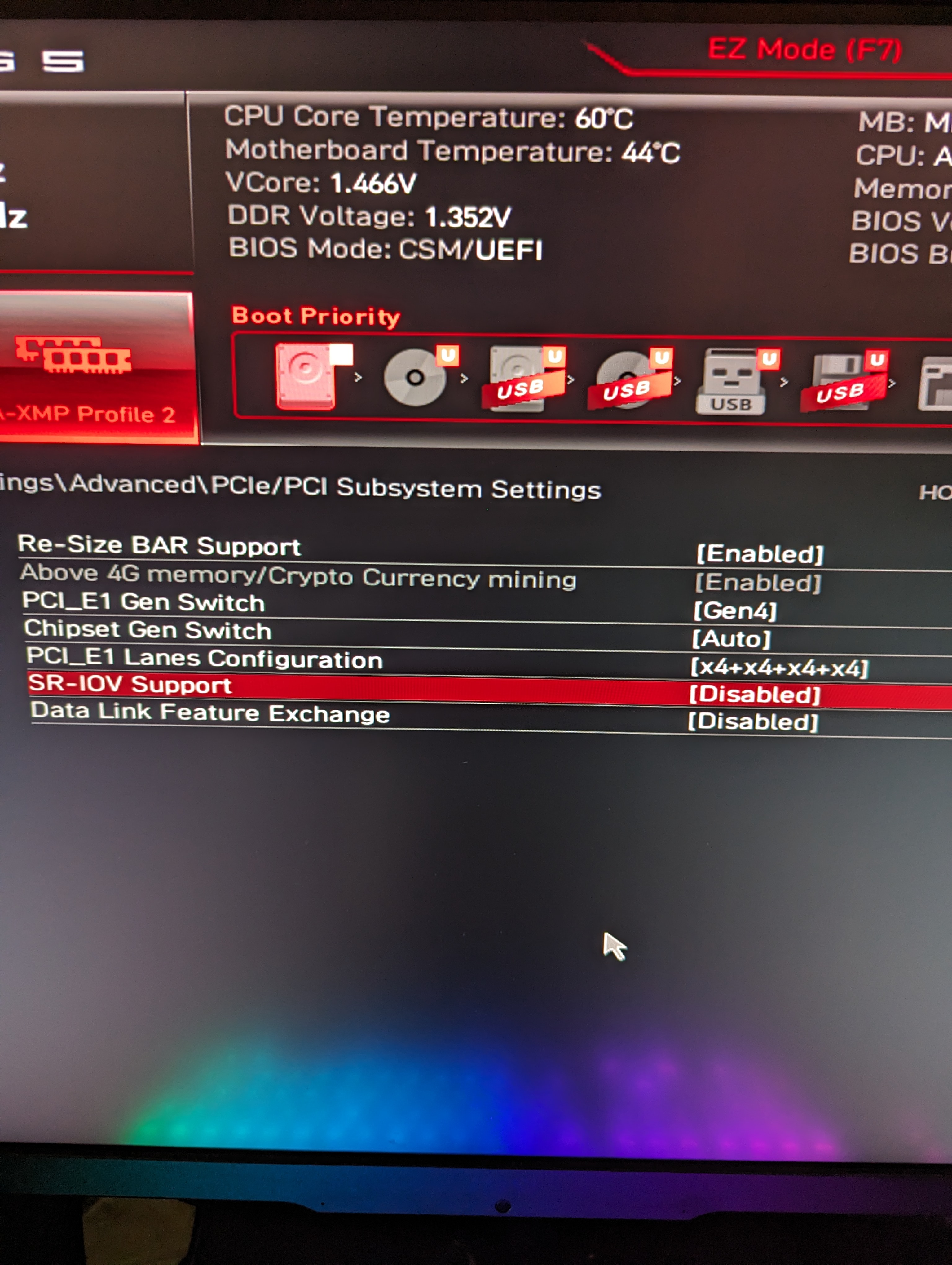 ...ich habe dann die Grafikkarte auf den unteren pcie 3.0 Anschluss gesetzt und bekam ein Bild das hat mich verwundert.so dann hab ich sie wieder auf den pcie 4.0 Slot gepackt wieder kein Bild und Boot Schleife. Aja was ich vergessen habe ich habe auch die untere NVMe ssd aus dem Slot genommen wie ich die graka auf den 3.0 Slot gesteckt habe. Das Lustige ist das so ein Buch LD bekomme sind aber beide m2 Slot belegt bekomme ich kein Bild auch auf dem 3.0 Slot nicht.dann hab ich die m2 vom unteren Slot draußen gelassen und bin ins BIOS gekommen und habe die pcie_e1 Lanse auf 4×4×4×4 eingestellt und der PC hat dann auch auf dem pcie 4.0 mit beiden m2 SSDs gebootet.Aber der PC bootet nur mit dieser Einstellung eine Frage heißt das dann das der pcie 4.0 Anschluss auch nur mit Mal 4 arbeite weil das Problem ist er startet auch mit keinen anderen lane Einstellung auch mit 8×8×4 nicht und auf Auto schon garnicht l.hoffe vieleicht kann mir jemand helfen wie man das Problem lösen kann.Ich habe auch im Mainboard Handbuch nix gefunden deswegen wende ich mich an euch