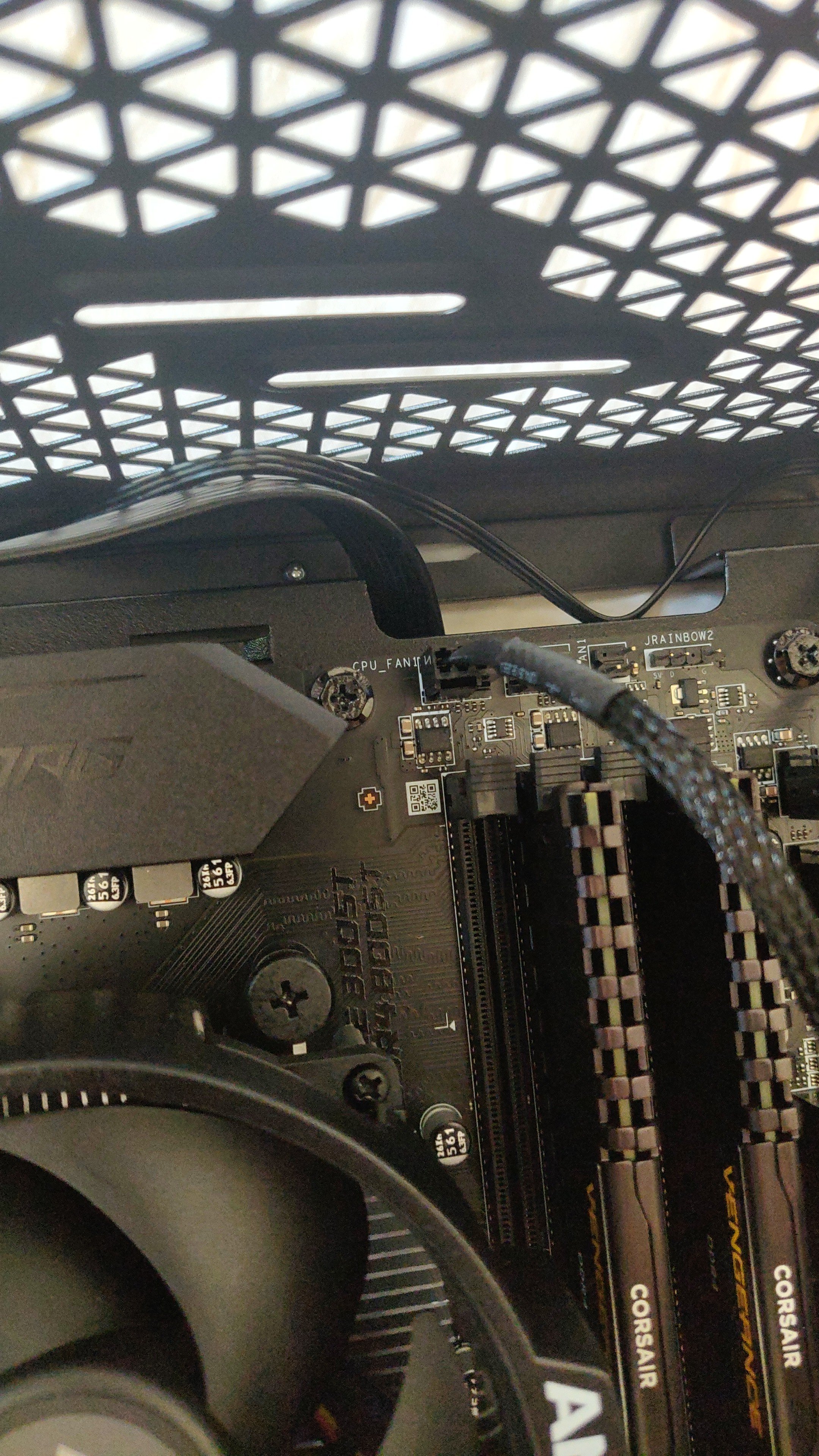 Die VGA-Leuchte am MB leuchtet durchgehend. Die CPU läuft warm, ohne, dass sich die Lüfter einschalten. Dann schaltet sich der PC ab (denke wegen CPU zu heiß, das passiert nicht jedes mal). Bis jetzt konnte ich die Fehlerquelle nicht identifizieren, bin aber auch blutiger Anfänger was das ganze angeht. (Habe versucht Bilder von der Hardware zu machen, hoffe man erkennt etwas).