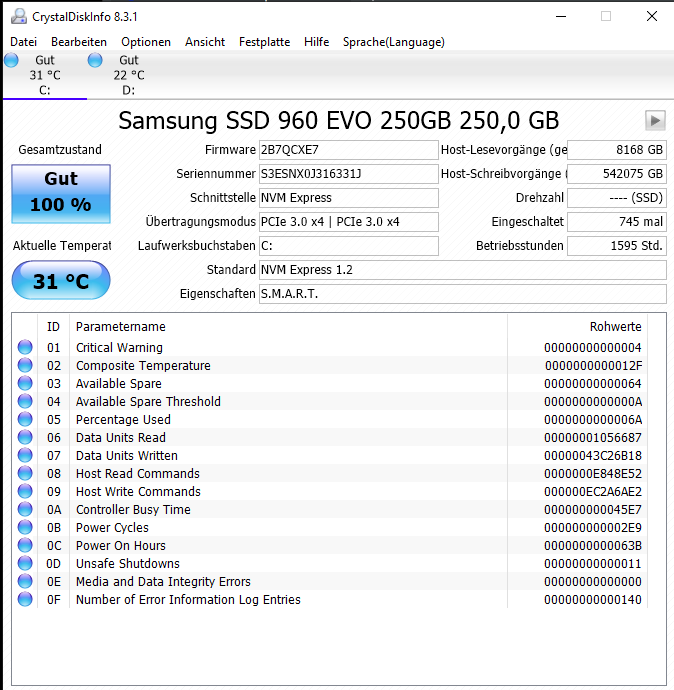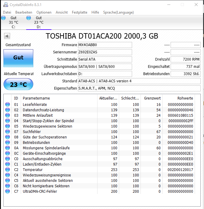 Laut SMART Bericht ist der Start/Count für den Fehler verantwortlich. Der Wert liegt bei knapp 750. Meiner Einschätzung nach, ist das aber kein kritischer Wert, zumal mein PC einen ähnlichen Wert hat und keine Probleme macht.