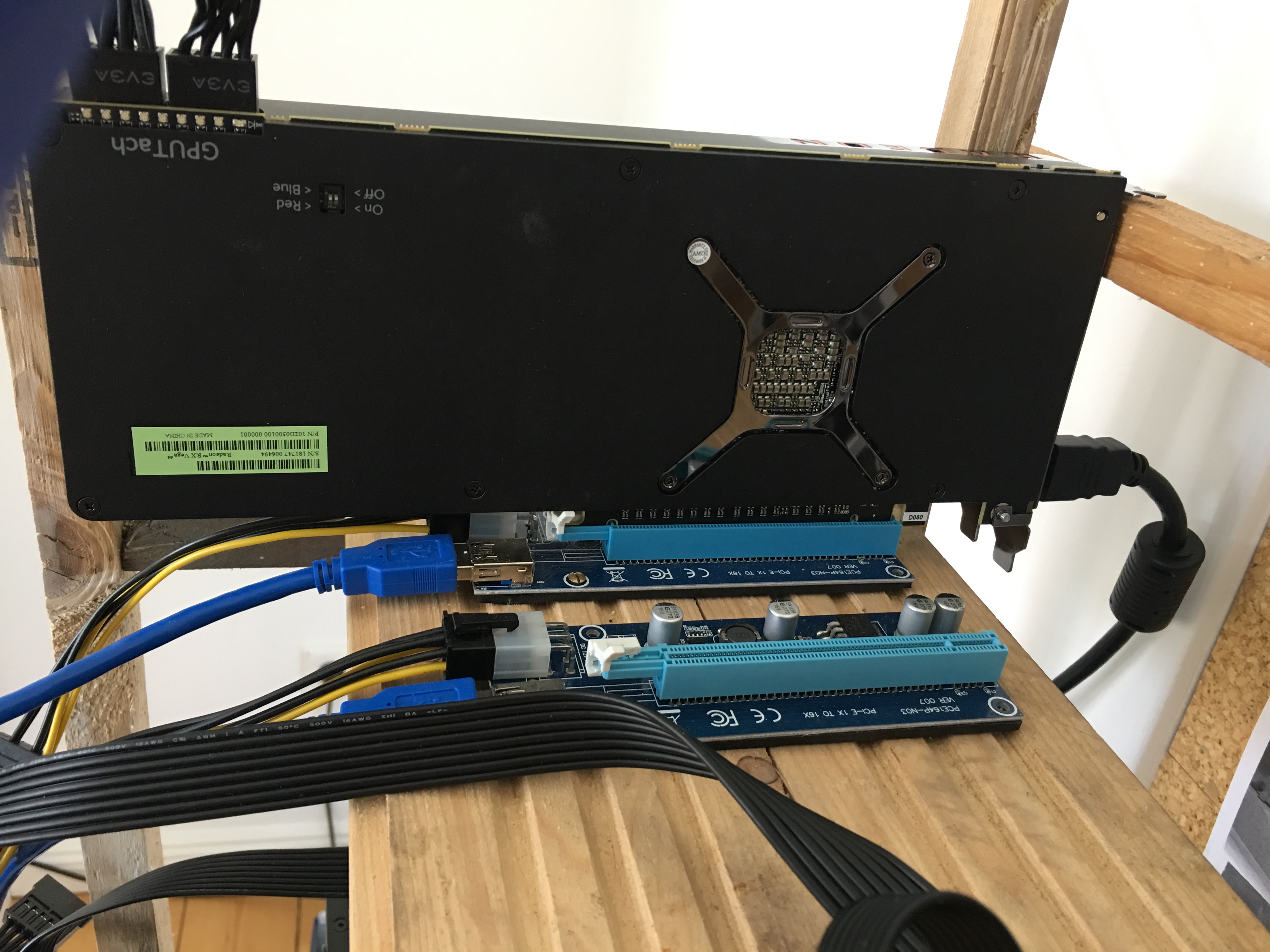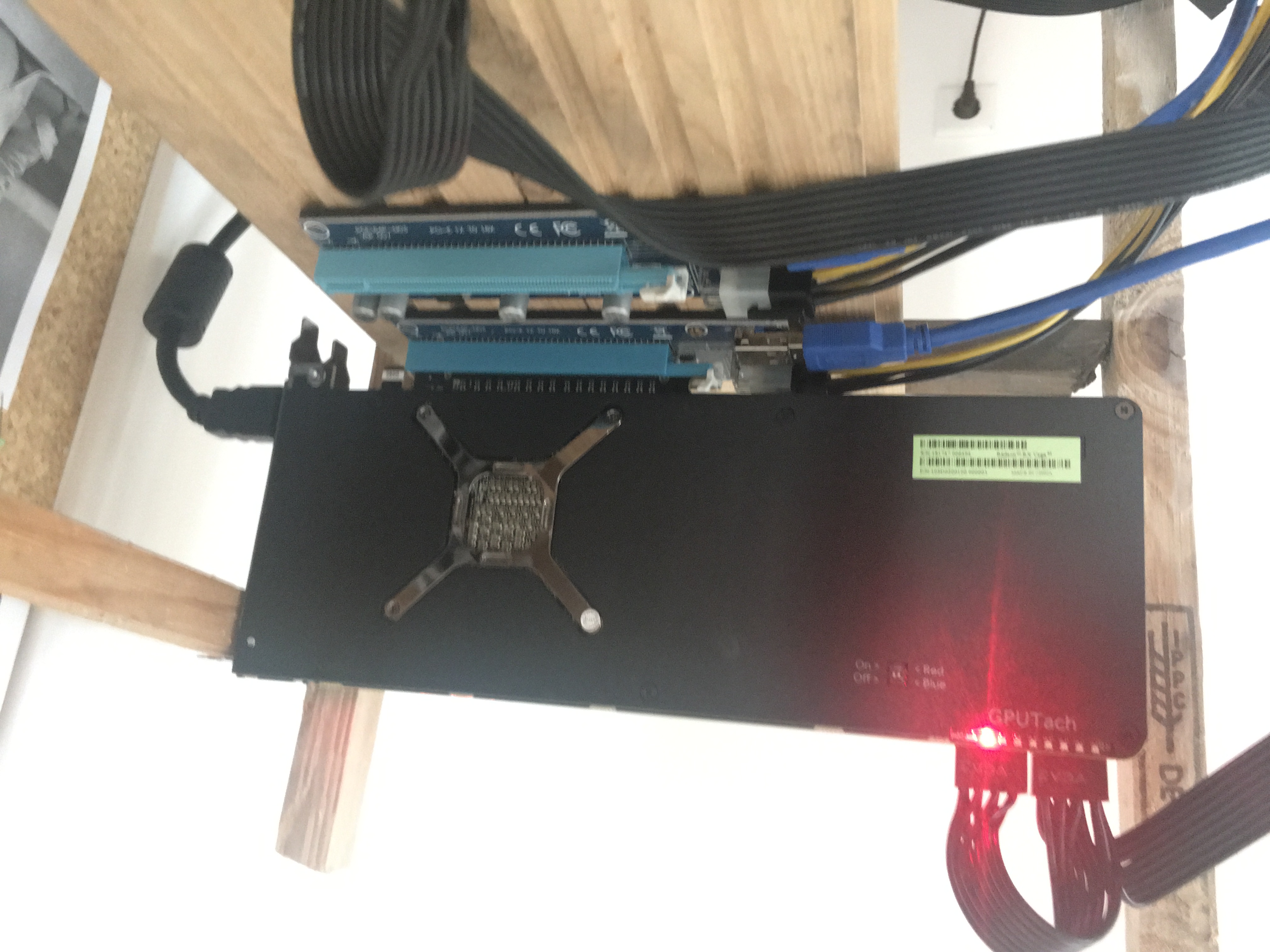Zusammengebaut habe ich das ganze dann heute, zunächst provisorisch um die Kompatibilität zu test. Dabei habe ich nur CPU, RAM, Netzteil und Motherboard angeschloßen. Dabei lief alles Einwand frei, das system bootete ins bios so wie es sich gehört. im Anschluss habe ich dann noch die PCI-e Adapter und die eine GPU angeschlossen (siehe Bilder). Zudem habe ich noch die SSD verkabelt, auf dieser is Windows vorinstalliert. Wenn ich nun den PC starte scheint alles zu laufen, der GPU Ventilator geht an, der CPU Ventilator geht an, jedoch erscheint kein Bild auf dem Monitor.