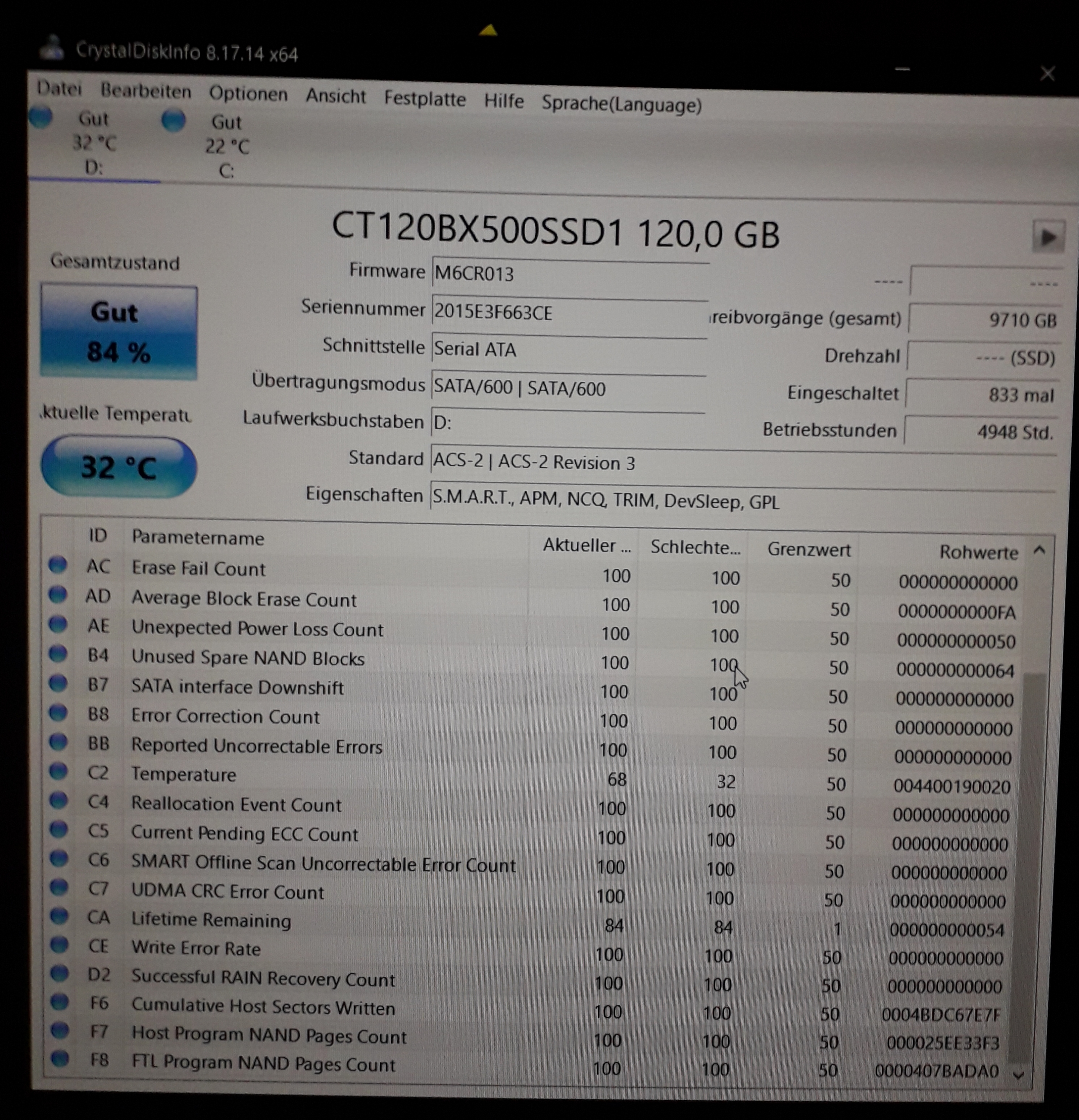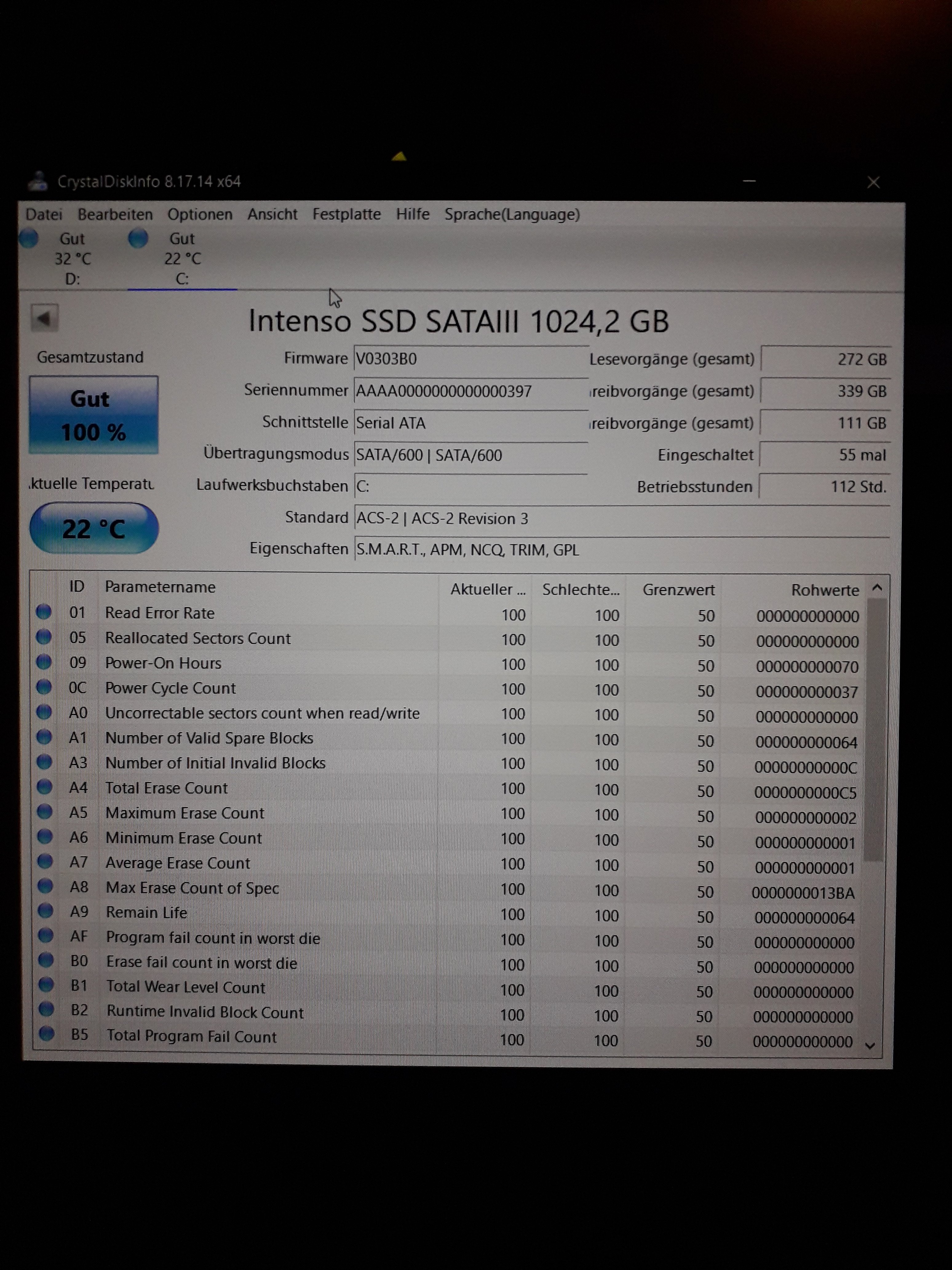 Das ist ein Programm, was du dir aus dem Internet laden und installieren musst. Dann starten und davon ein Screenshot posten, wo man alle Werte siehtDraken_08 schrieb:Wo kann ich die "Crystal Disk Info" einsehen?