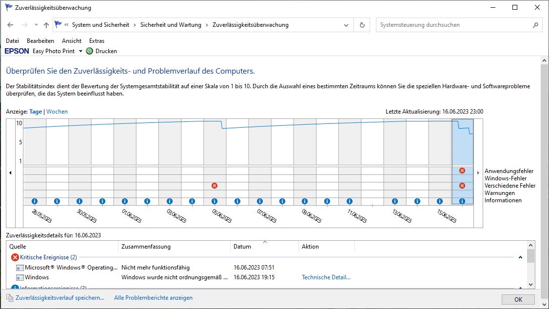 Hier mal ein Screenshot vom Zuverlässigkeitsverlauf: