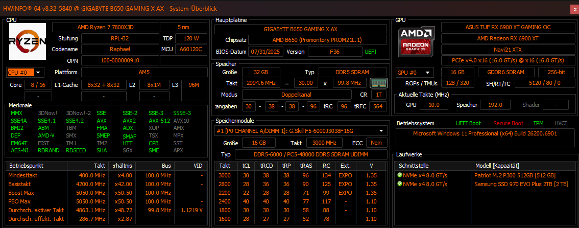 - Arbeitsspeicher (RAM): 2x 16 GB G.Skill Trident Z5 Neo DDR5-6000