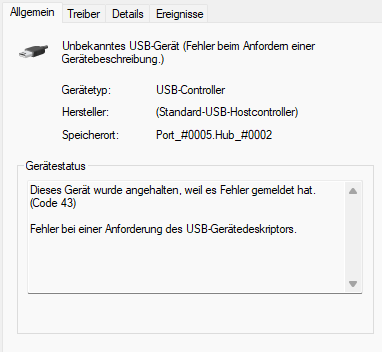 Im Geräte-Manager wird mir angezeigt ( Unbekanntes USB-Gerät, fehler beim Anfordern einer Gerätebeschreibung). Ich weiß aber nicht welches USB-Gerät er damit meint.