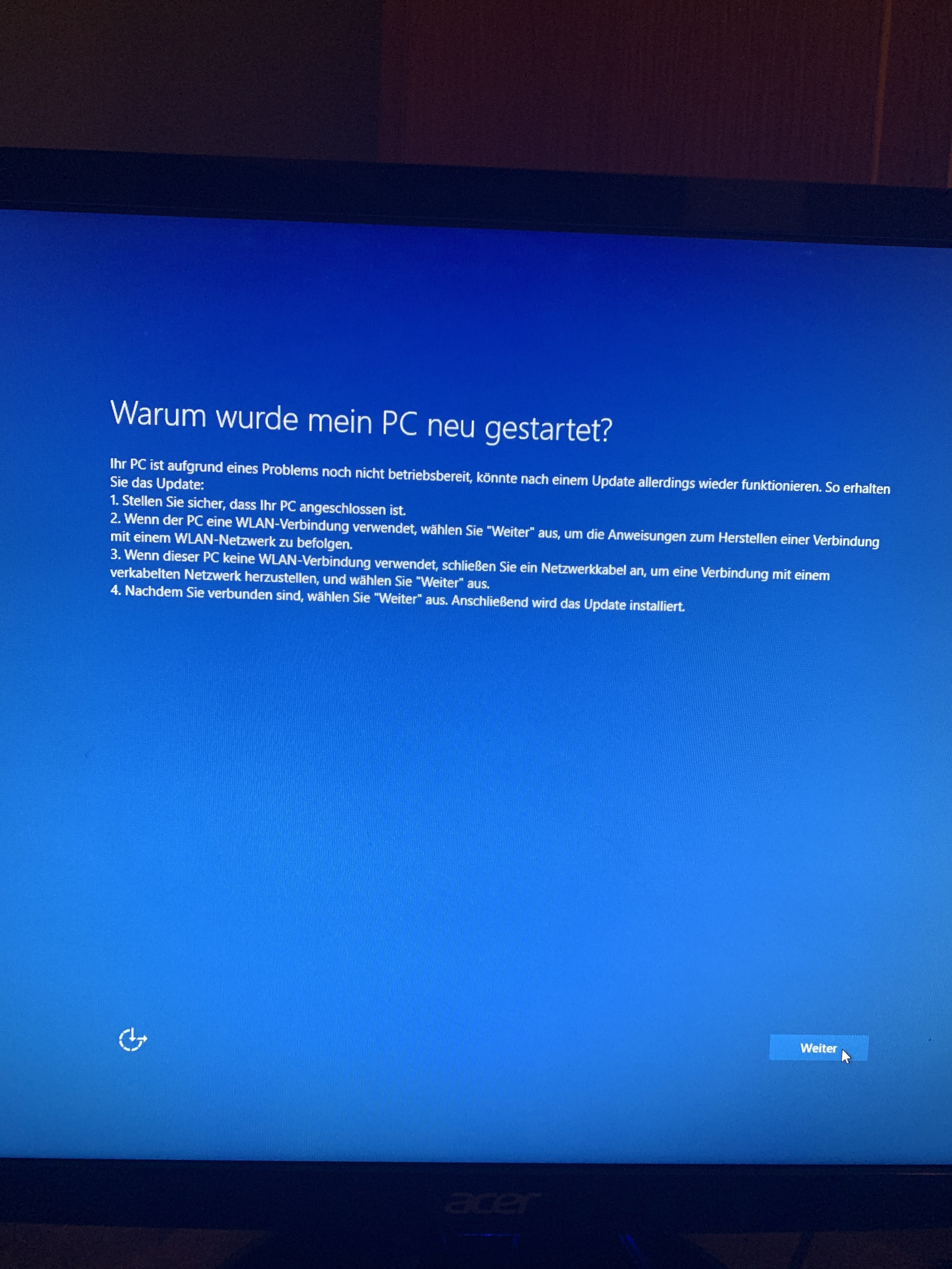Also nach ca 6 Stunden ist Win 10 nun neu aufgesetzt. Jetzt kommt allerdings diese Fehlermeldung. Neustart bringt auch nichts. Hab es mit 3 verschieden Lan Kabeln versucht.