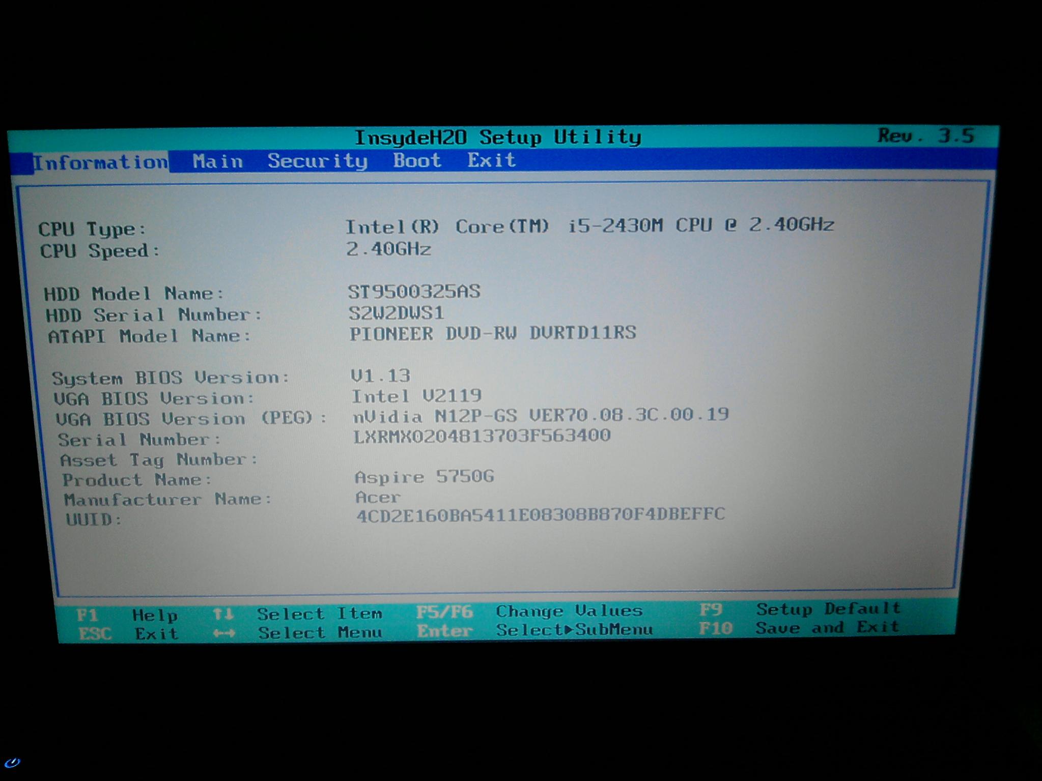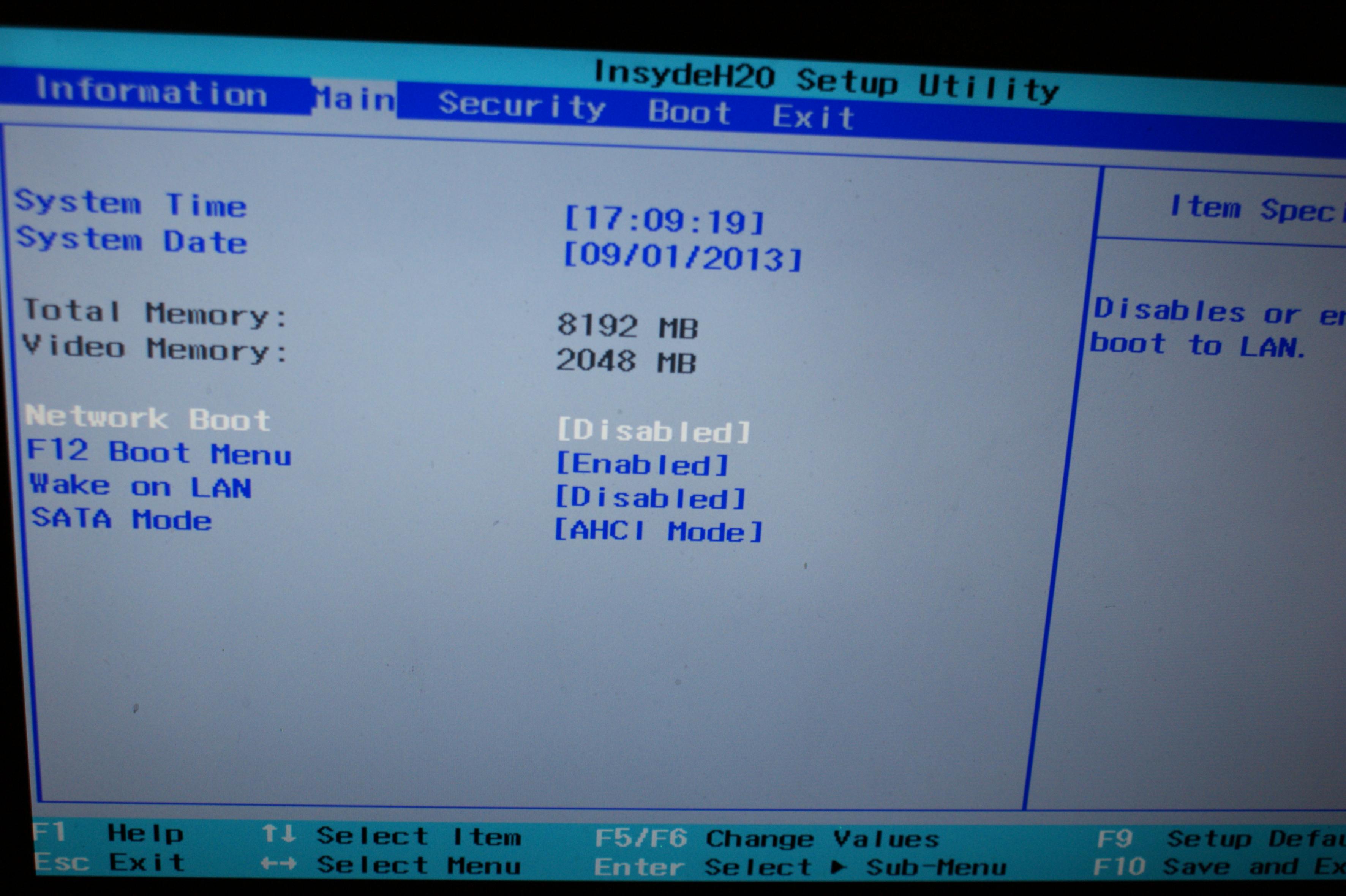So (oder so ähnlich) gelangst du ins Bios: Beim hochfarhen des Laptops auf die Taste F2 (bei dir kann das eventuell eine andere Taste sein) draufhämmern bis sich das Biosfenster öffnet (also nicht warten bis zum Windowsladebildschirm). Dann müsste es so (oder so ähnlich) aussehen: