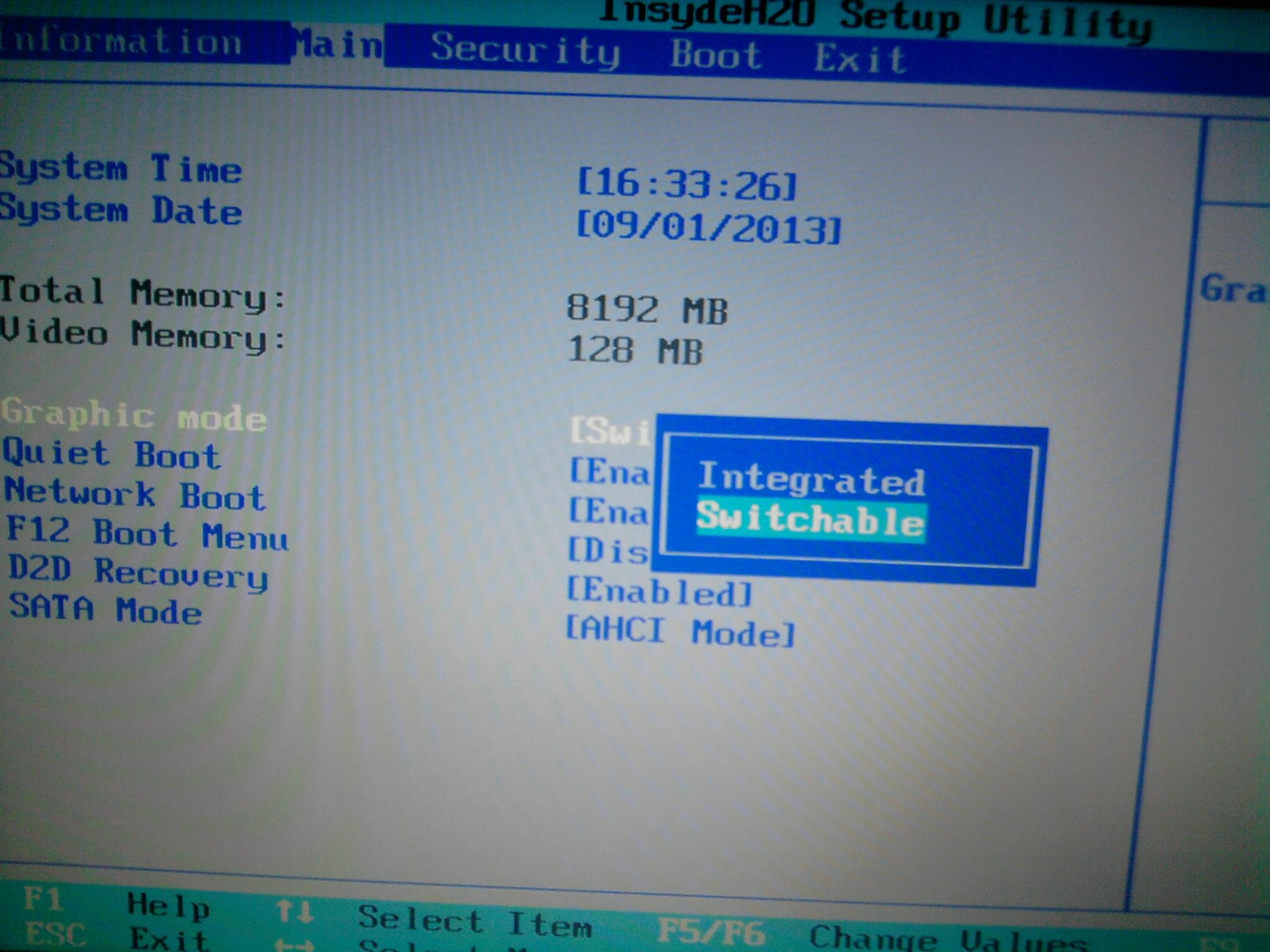 Nun schaust du bei "Graphic Mode" ob integrated oder switchable eingestellt ist. Wenn bei dir Integrated ist, dann auf switchable ändern und abspeichern nicht vergessen.