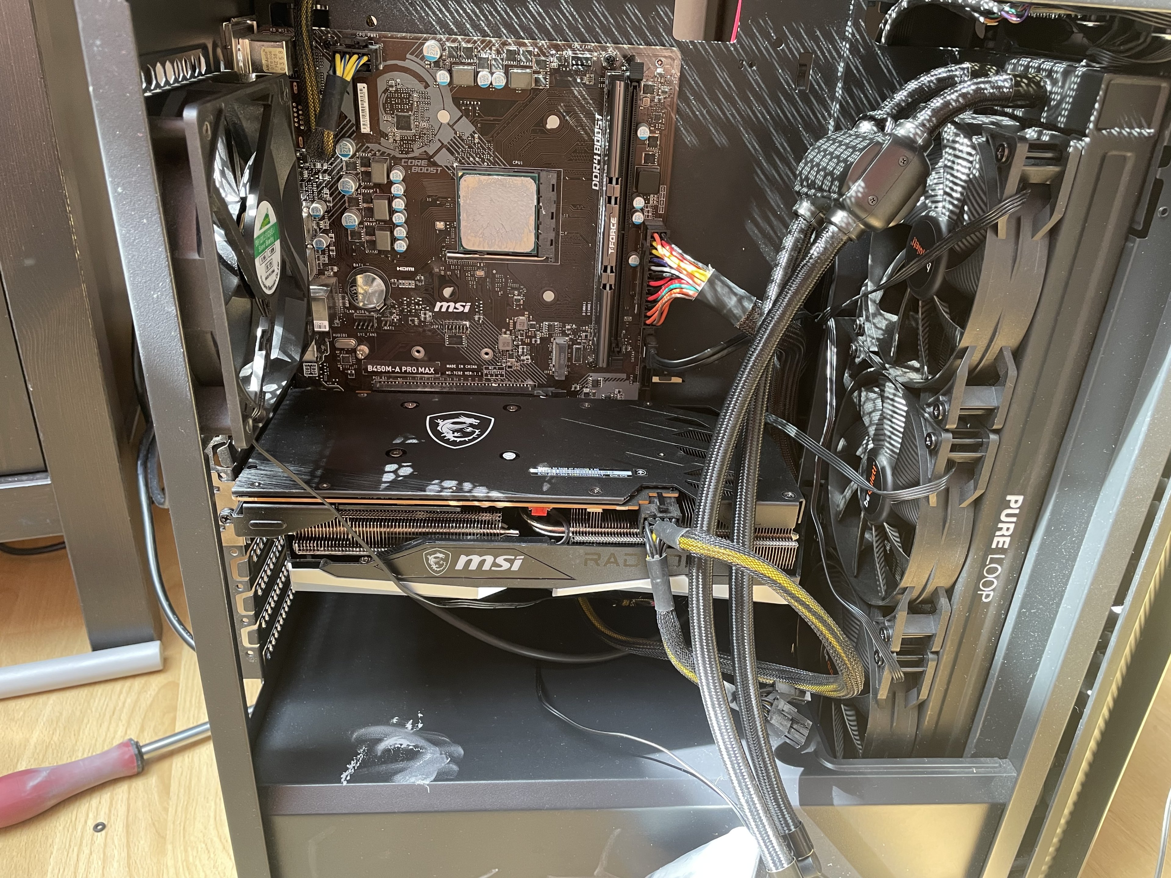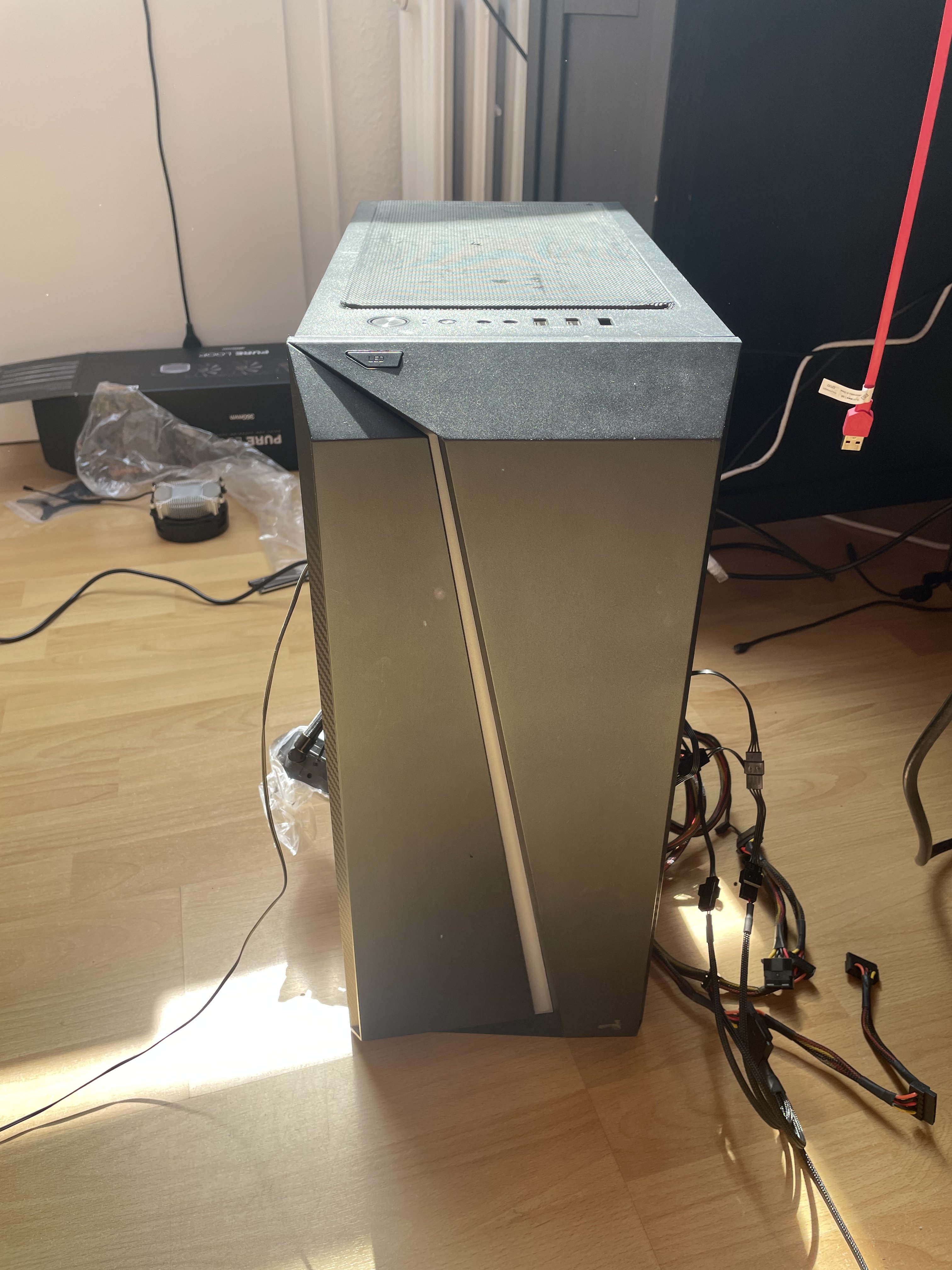 Der Gedanke ohne kühler war Strom zu sparen dass er sich nicht sofort abschaltet um ins Bios zu kommen. Das ist das Gehäuse, ich habe die Front für den Lüfter abgenommen. Das Kabelmanagement wird noch geändert sobald er wieder laufen sollte. Ist gerade alles provisorisch. mein Plan wäre nun sobald ich ins bios kommen sollte den kühler anzuschliessen und auf die CPU zu legen, dafür alles andere wie z.b. bildschirm abschliessen dass das update dennoch durchläuft und die CPU gekühlt wird ^^