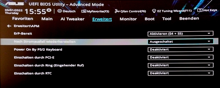 Da muss ich passen. Keine Ahnung, wie ich die Karte dort deaktivieren kann. Die Einstellung im Geräte-Manager habe ich gemacht. Auch hier keine Veränderung.eYc schrieb:Die Netzwerkkarte im BIOS mal deaktiviert, falls möglich, oder deren WoL-Funktionen (auch im Gerätemanager das "Gerät kann den Computer ... aufwecken"?