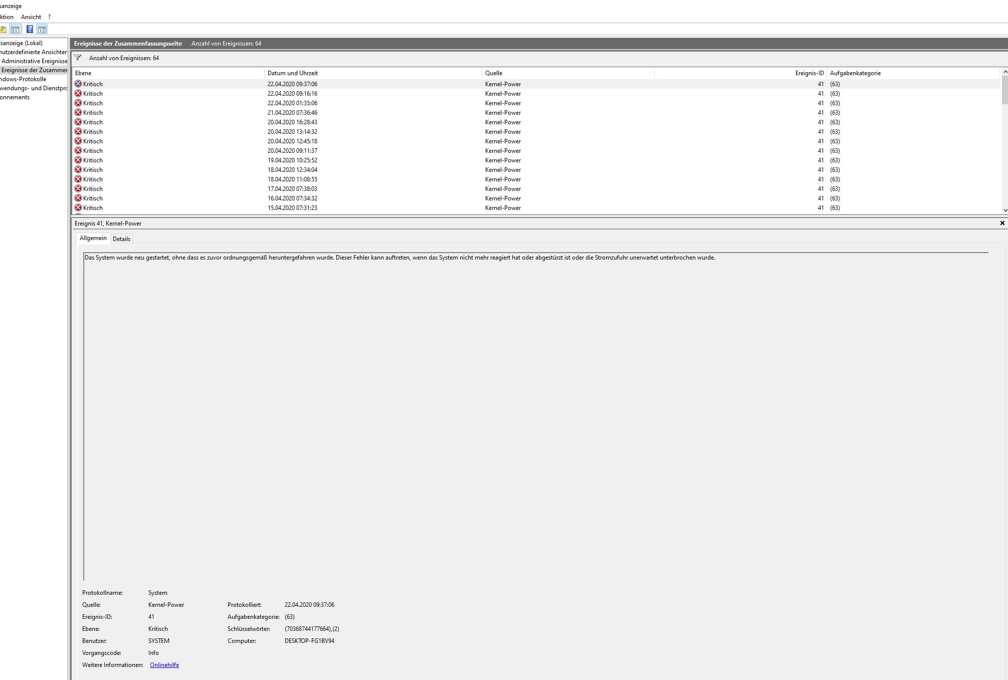 Du könntest bitte die Fehlermeldungen in der Ereignisanzeige noch aufklappen, bzw. man kann zu den Meldungen die Details anzeigen lassen. Aber erstmal steht da nichts was eindeutig "hier ich bin 100% die Ursache" sagt. Die Kernel41 Fehler sagen nur, dass er nach einem nicht ordnungsgemäßen runter fahren wieder gestartet ist. Also eher Symptom und nicht Ursache.