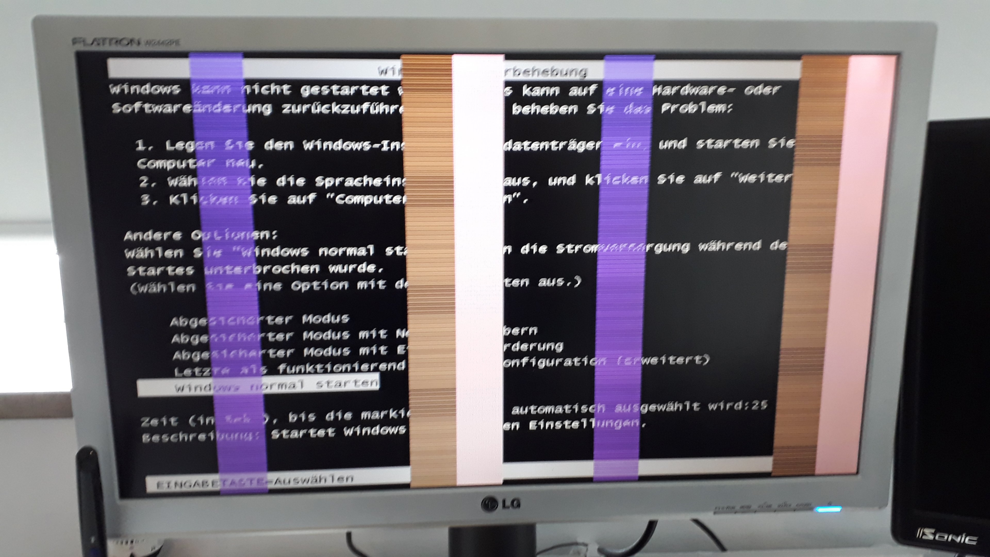 gestern ist er einfach abgestürzt. seitdem folgendes Bild beim hochfahren. danach kommt noch kurz Windows wird gestartet, danach blackscreen.