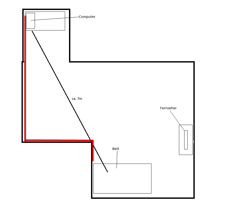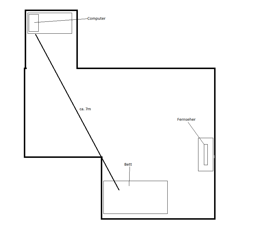 Luftlinie 5-7 m, steht Wand ecke im weg (siehe Bild), ich liege aber seitlich zum pc also schau ich nicht in die Richtung.