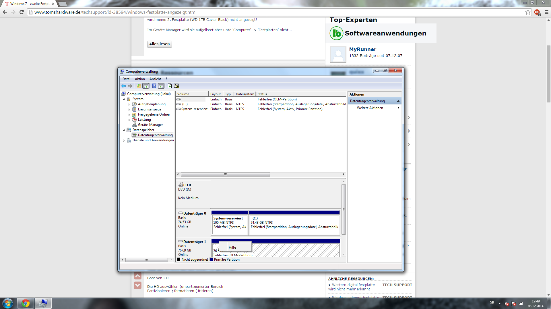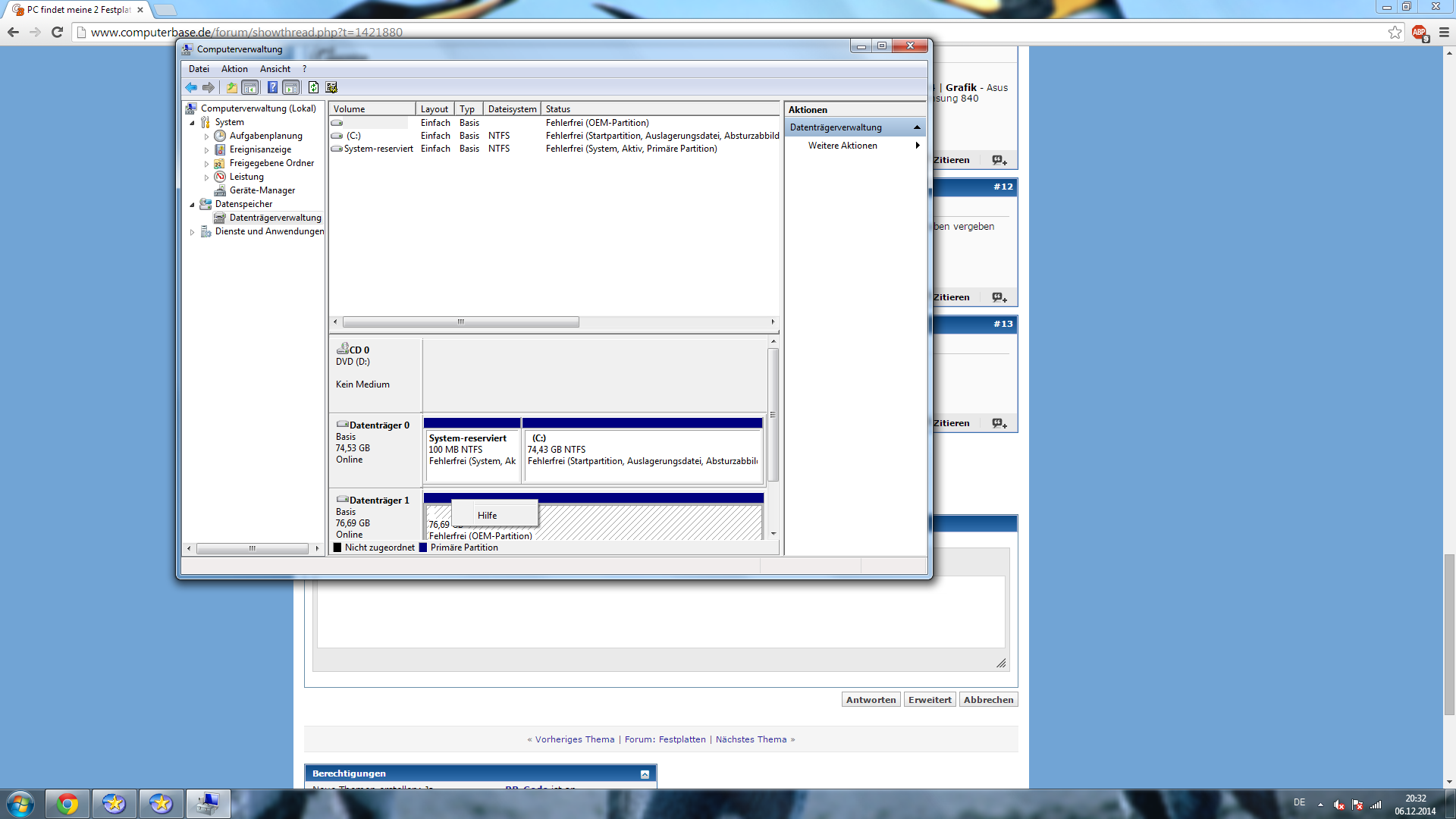 Ich habe meiner Freundin ein PC mitgebacht mit Windows 7 drauf, habe 1 Festplatte ( System ) eingesteckt und gestartet, funktioniert perfekt, dann PC runtergefahren und die 2 Festplatte eingestellt und die Festplatte wird im Geräte Manager auch angezeigt aber unter Computer leider nicht. So , jetzt wollte ich in der Datenträgerverwaltung einfach ein Pfad vergeben aber da geht leider garnix, hier ein kleines Bild. Und wenn ich auf die Spalte mit " Datenträger 1 " gehe, und dort Rechtsklick mache kann ich die Festplatte " In die Dynamischen Datenträger Konventieren " aber das geht leider auch nicht, weil die Fehlermeldung kommt das nicht genung speicher ist, aber die Festplatte ist doch komplett leer o.O