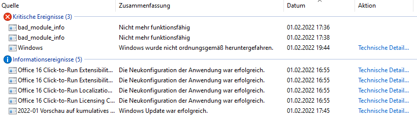 Fehler: ID 6008 "Das System wurde zuvor am 01.02.2022 um 19:28:27 unerwartet heruntergefahren."