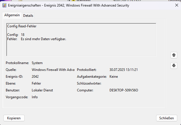 @Lumpi97 Den Fehler mit "Windows Firewall" ID2042 kannst Du ignorieren. Das ist ein Fehler von Microsoft seit dem letzten Update und bewirkt nicht Deine Probleme.