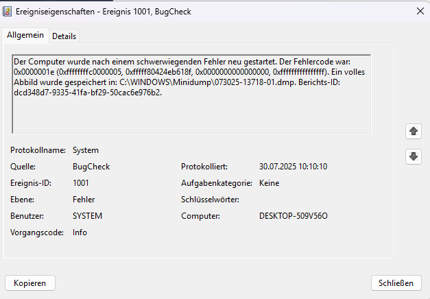 Scrolle mal in der Ereignisanzeige weiter runter bis zu dem Fehler "BugCheck.." und hier klickst Du den Fehler mal. Dabei wird darunter werden dann weitere Details dazu angezeigt.