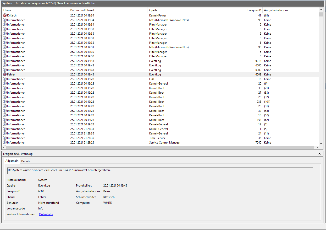 PC forced heruntergefahren und hochgefahren, sowie wie die letzten Male in das Ereignismonitor geschaut. Siehe da, es zeigt das selbe an wie bei den beiden Malen zuvor: Mehrere Minuten, bevor ich wieder dran wollte: Das System wurde zuvor am 25.01.2021 um 23:40:57 unerwartet heruntergefahren. - Ca. 40m später wollte ich ihn mit der Maus wecken zum herunter fahren.
