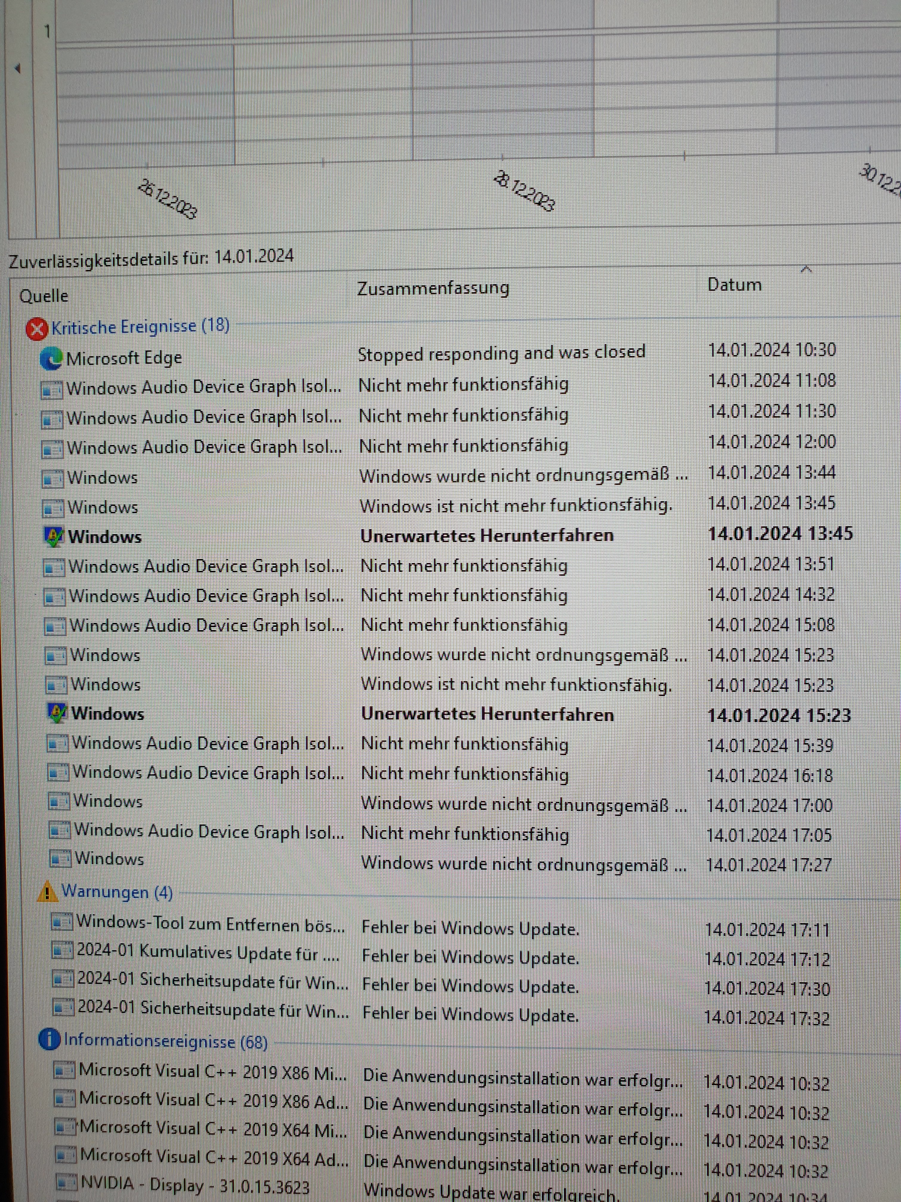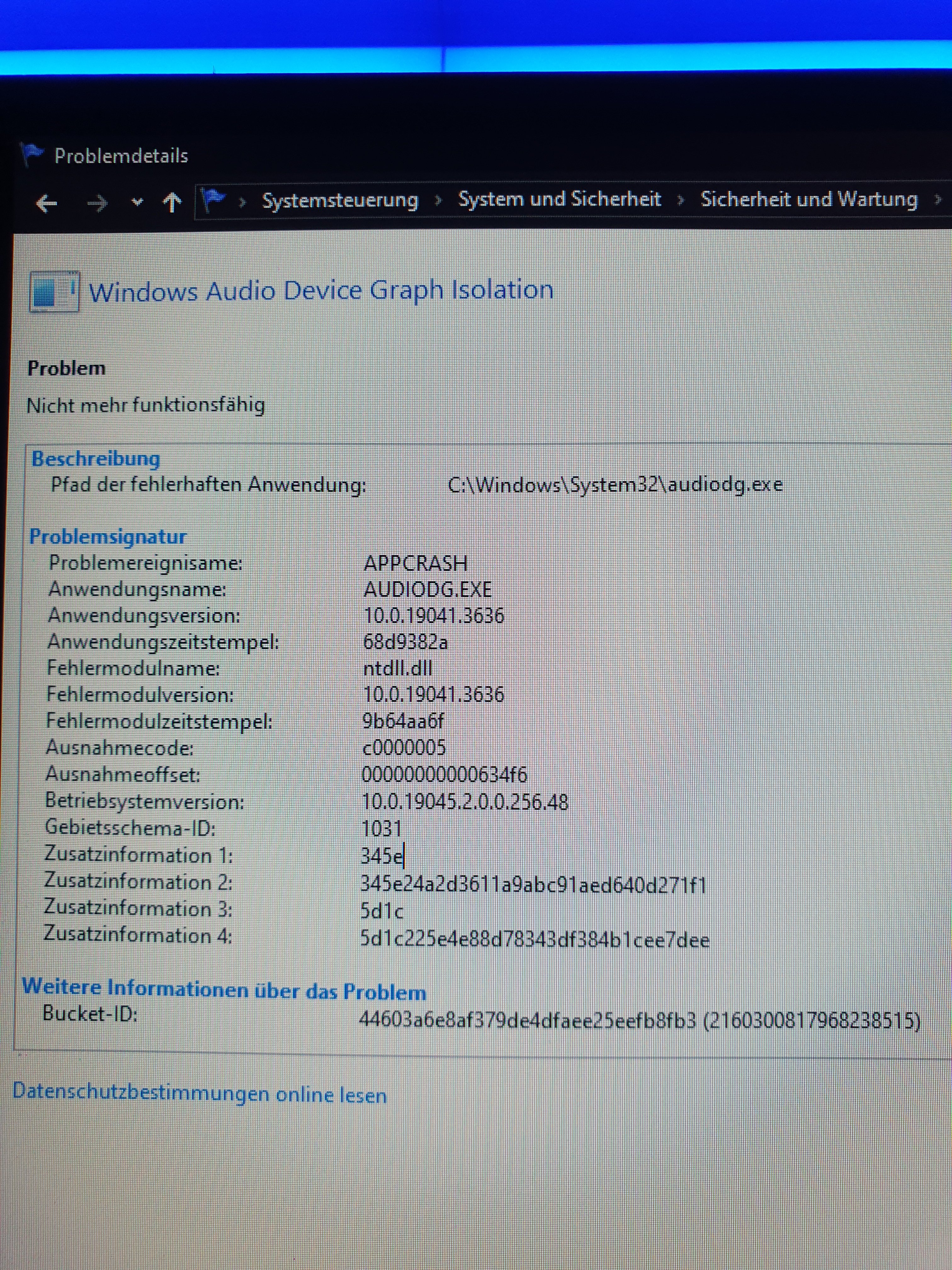 Ich habe in den Zuverlässigkeitsverlauf geschaut und dort steht "windows audio device graph isolation nicht mehr funktionsfähig"