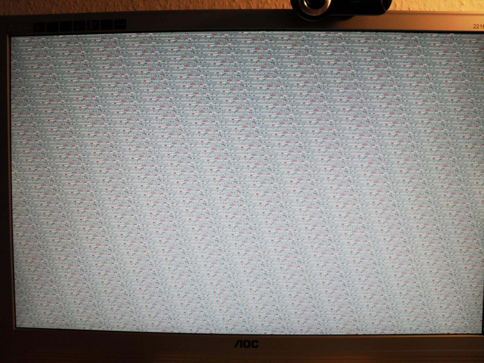 Weder Maus noch Strg-Alt-Entf. Ich kann ihn dann nur noch restarten und er lädt dann die alte Sitzung neu. Es sit kein Bluescreen sondern der Monitor verfärbt sich mal tor dann grün, dann blau. Aber es gibt so ne Art Muster mit Strichen, von links oben nach rechts unten.