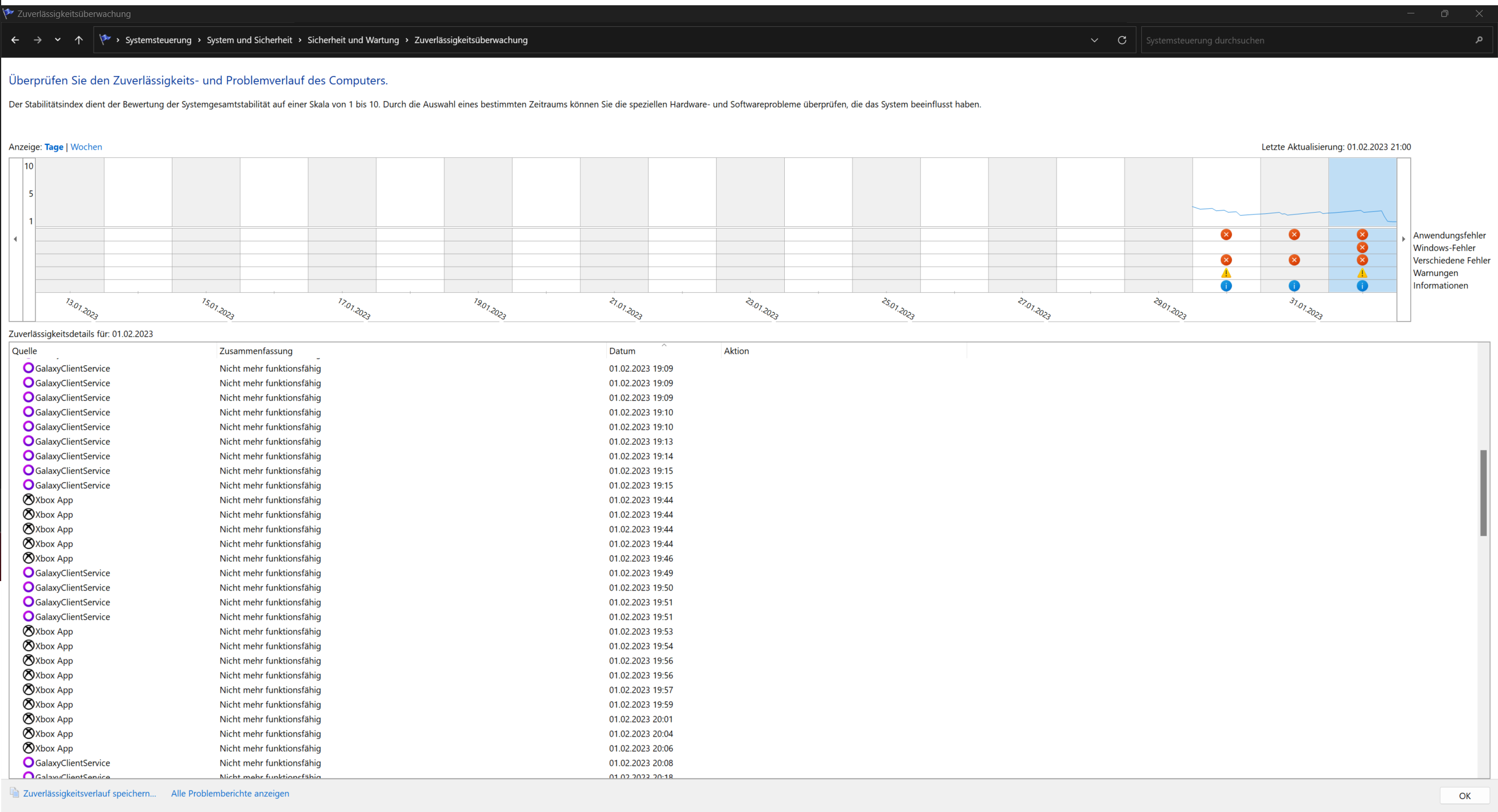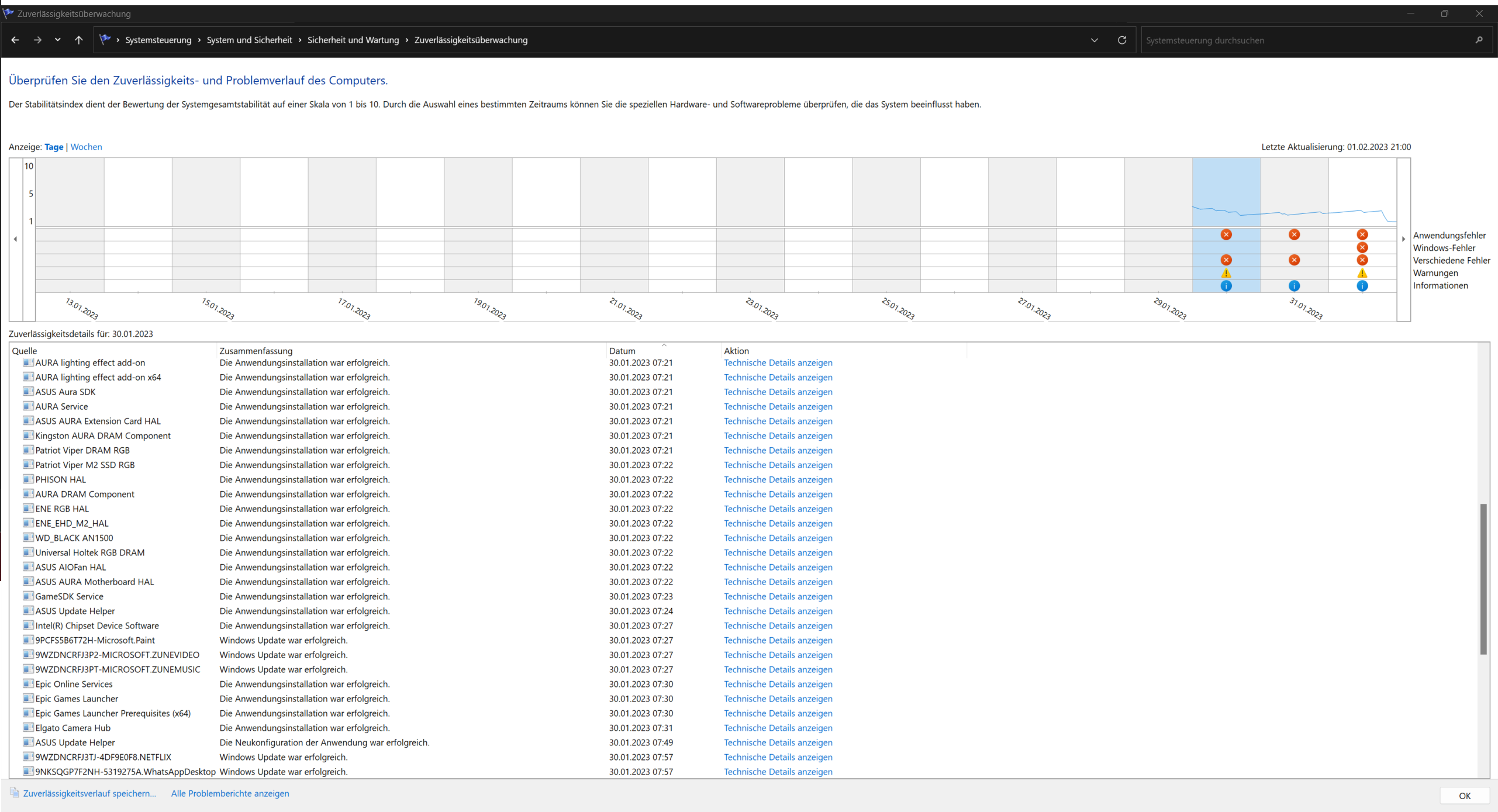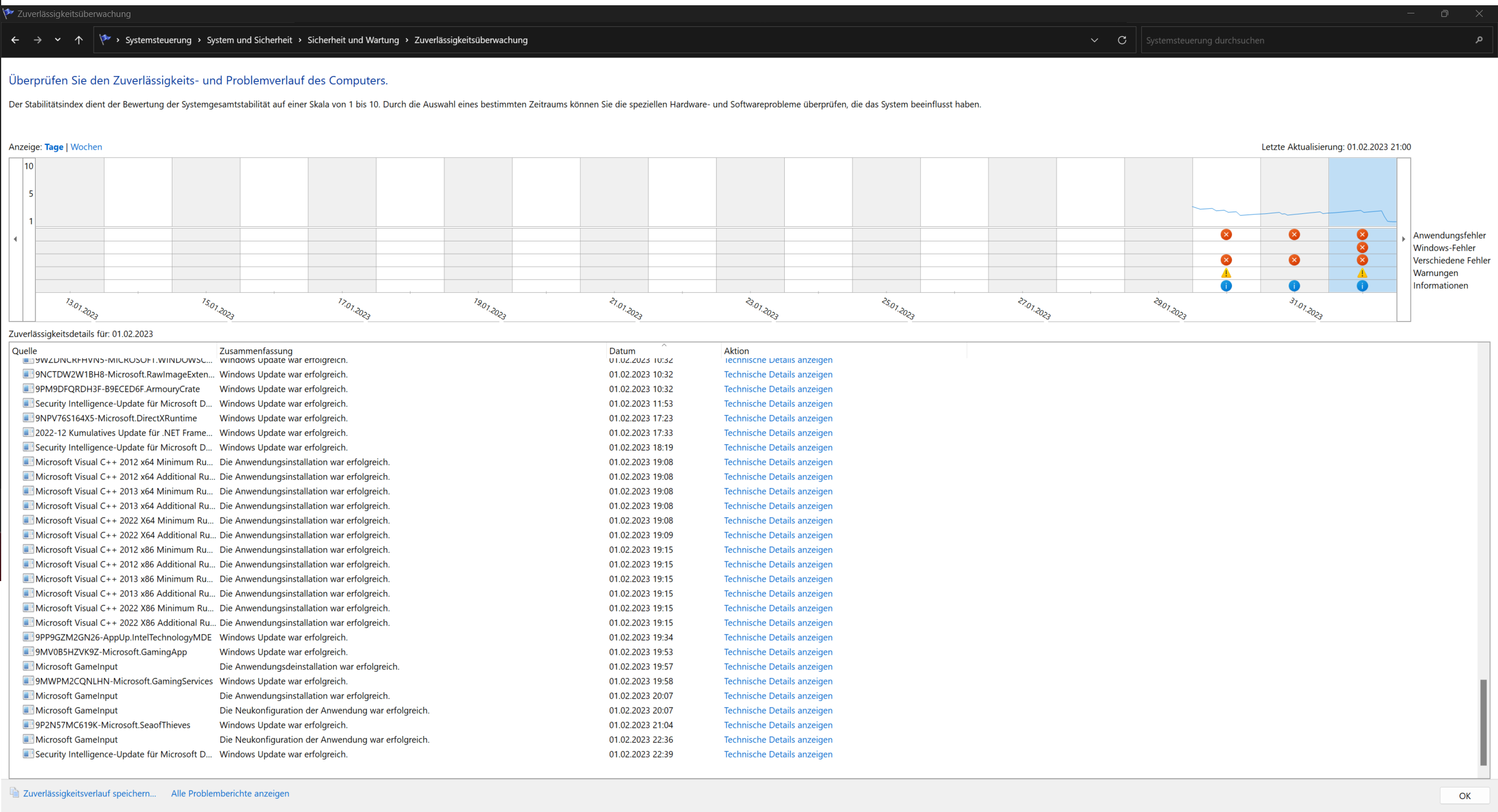Ich weiß ehrlich gesagt nicht mehr was ich machen soll. Im anhang werde ich ein paar Bilder von der Ereignisanzeige packen. In der Zuverlässigkeitsüberwachung ist auch zu erkennen, dass wenn der PC einfriert, immer gleichzeitig mit Microsoft GameInput was passiert ist. Vielleicht gibt es da ja einen zusammenhang?