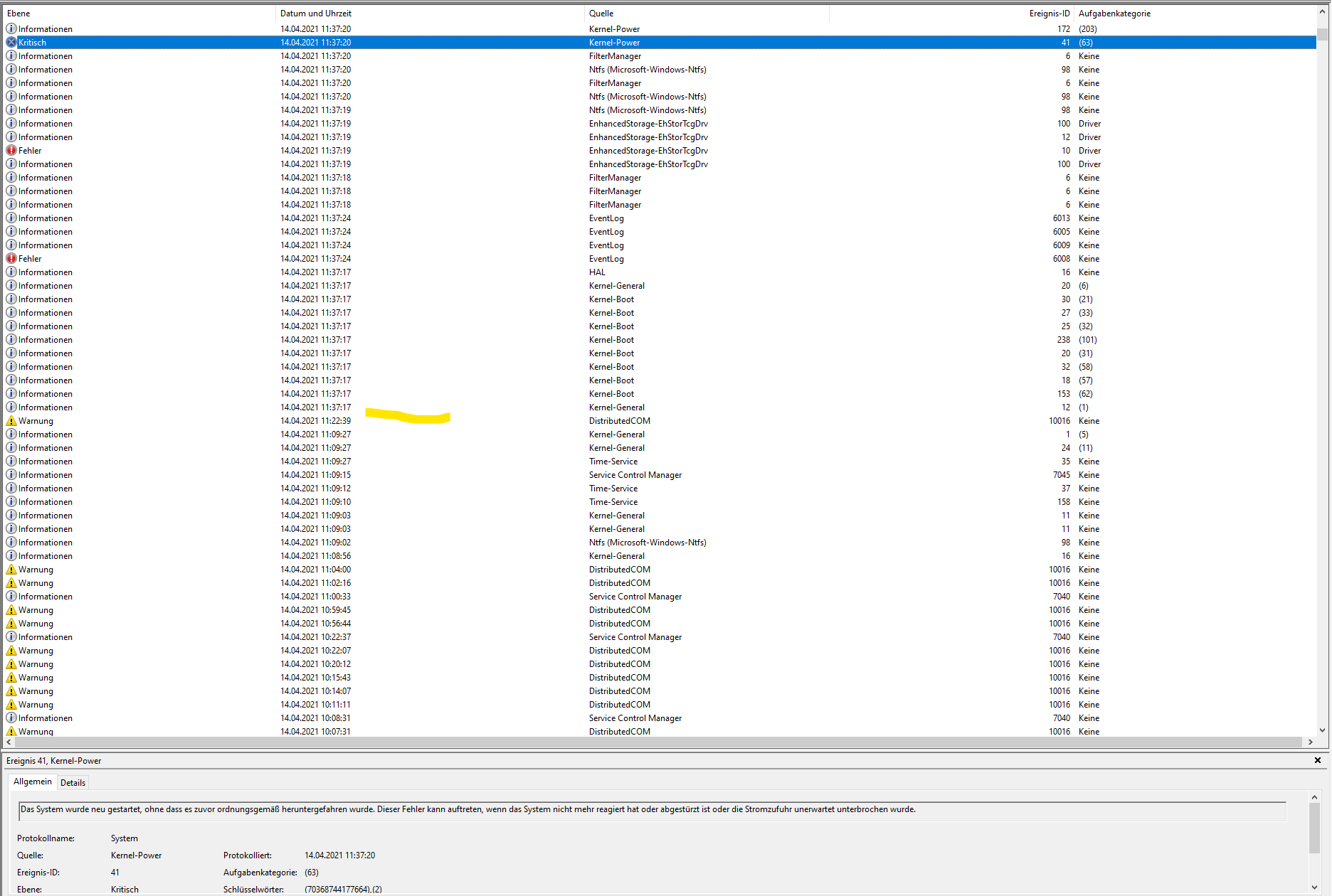 Wenn ich dann in die Ereignisanzeige schaue, wird nur angezeigt, dass der PC zuvor nicht korrekt heruntergefahren wurde.