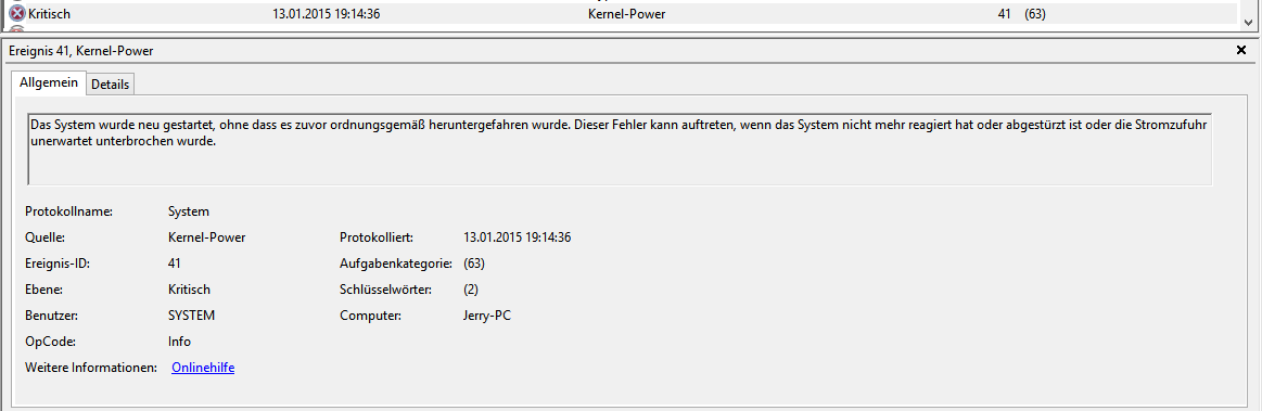 Ich habe mal zwei Screenshots von der Ereignisregistry beigefügt, in der auch zu sehen ist, dass Windows unerwartet heruntergefahren wurde.