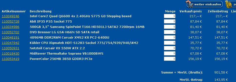 Könnt ihr irgendeinen Versand/Shop empfehlen? Muss nicht der günstigste sein, aber auch hier sollte Preis/Service stimmen, bzw. brauch ich ja auch einen Shop der die entsrechenden Teile (Grafikkarte) lieferbar hat.