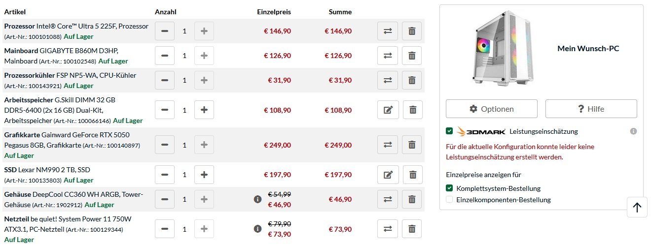 Die Geizhals-Wunschliste listet für manche Komponenten mehrere Artikel. Bei denen bin ich mir noch unsicher. Netzteil ist bereits vorhanden. Ich habe es der Vollständigkeit drin gelassen aber ohne Anzahl.