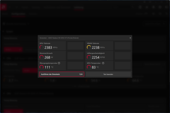 Die neueste Komponente ist die AMD Radeon RX 6950 XT Grafikkarte. Gestern habe ich sie erhalten. Erst mit dem heutigen Einbau der Grafikkarte kam es zu den besagten Abstürzen. Zuvor hatte ich eine GTX 1080 Ti. Die Grafikkarte erreicht unter Volllast 83°C und der Hotspot sogar ca. 113°C, obwohl mein PC ein ordentliches Airflow-System vorzuweisen hat. Der AMD-Stresstest kann einige Zeit laufen. Nur bei Spielen und Benchmark-Programmen kommt es nach wenigen Minuten zum Absturz.