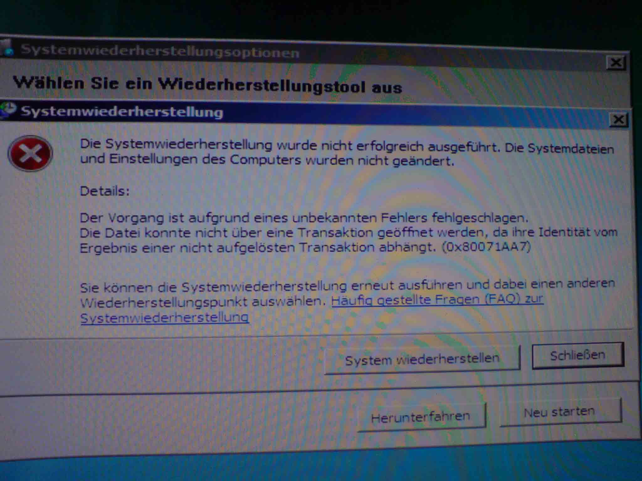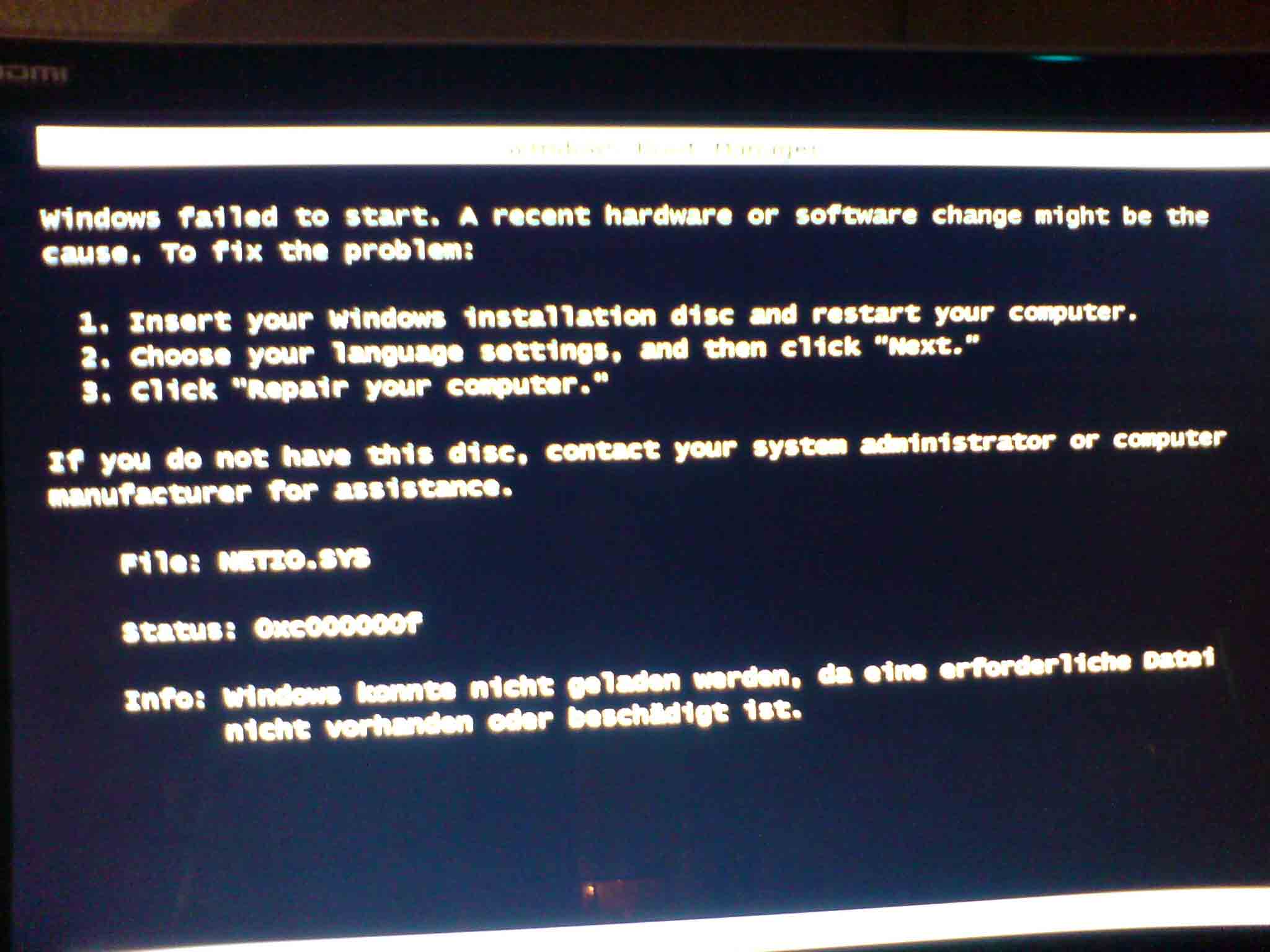 der PC meines Kumpels geht nicht mehr an, beim Startversuch bricht er ab und es kommt eine Fehlermeldung. Wenn er versucht mit der DVD eine Wiederherstellung zu machen, kommt auch ein Fehler. Beide habe ich mal als Bild angehängt!