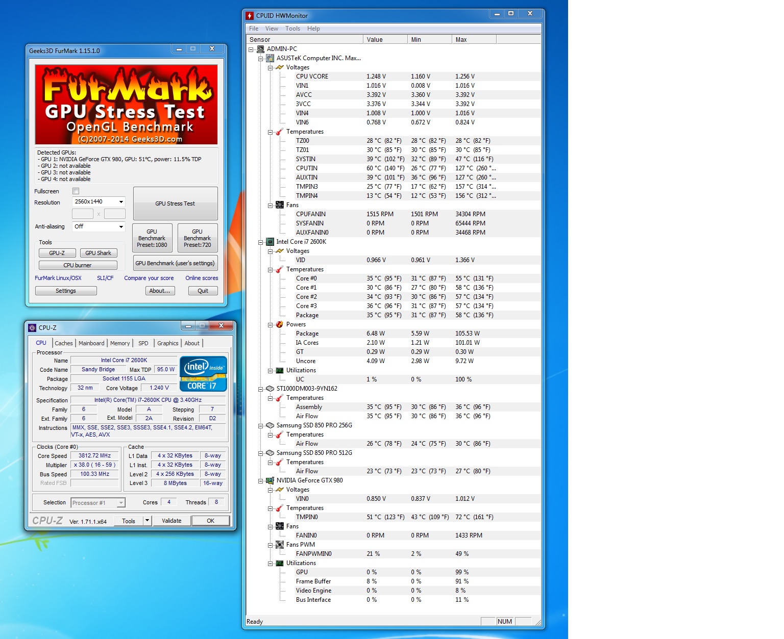 Nun gut, habe dann mit HWMonitor, Prime 95 und FurMark einen Test gemacht, und euch folgenden Screen gemacht.