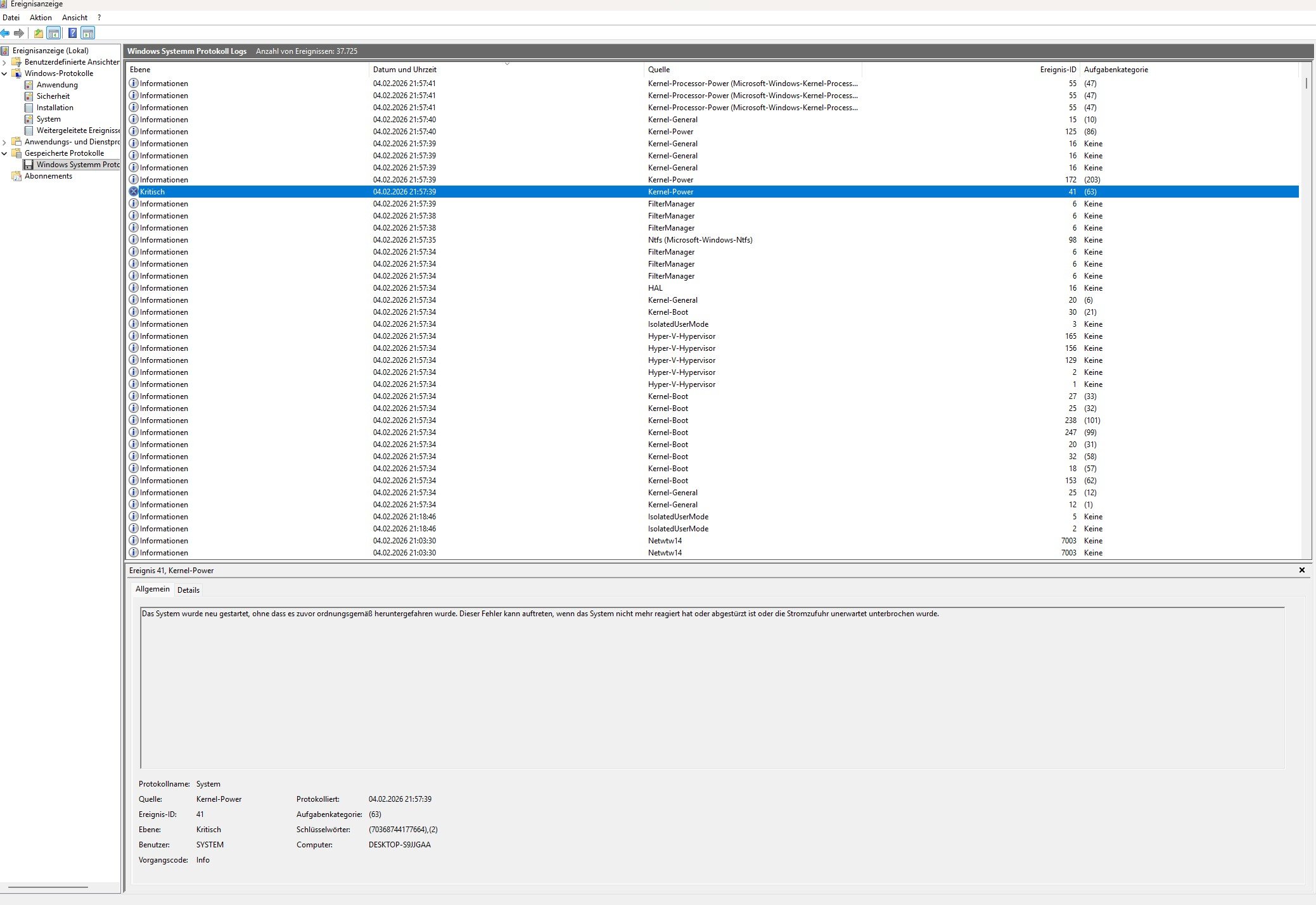 Laut Windows Aktivitäten Protokoll handelt es sich um einen Kernelpower-Fehler. Das Protokoll liegt mir als Datei vor.