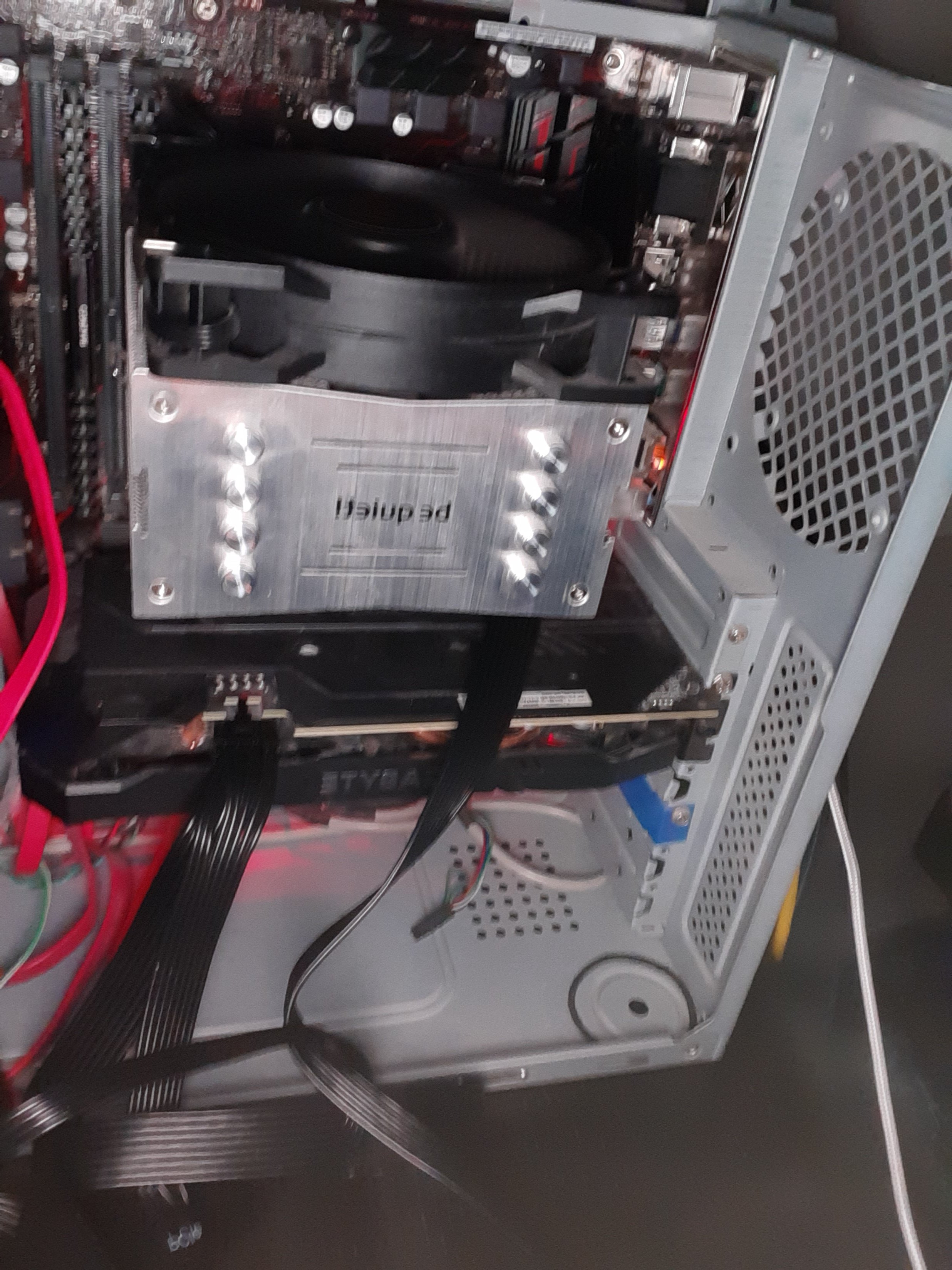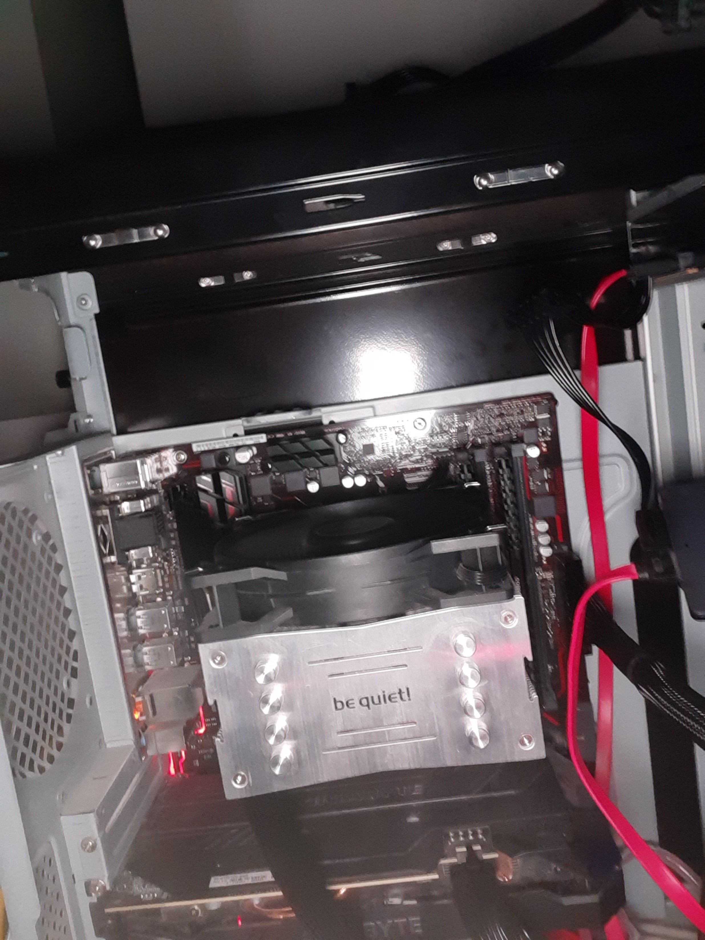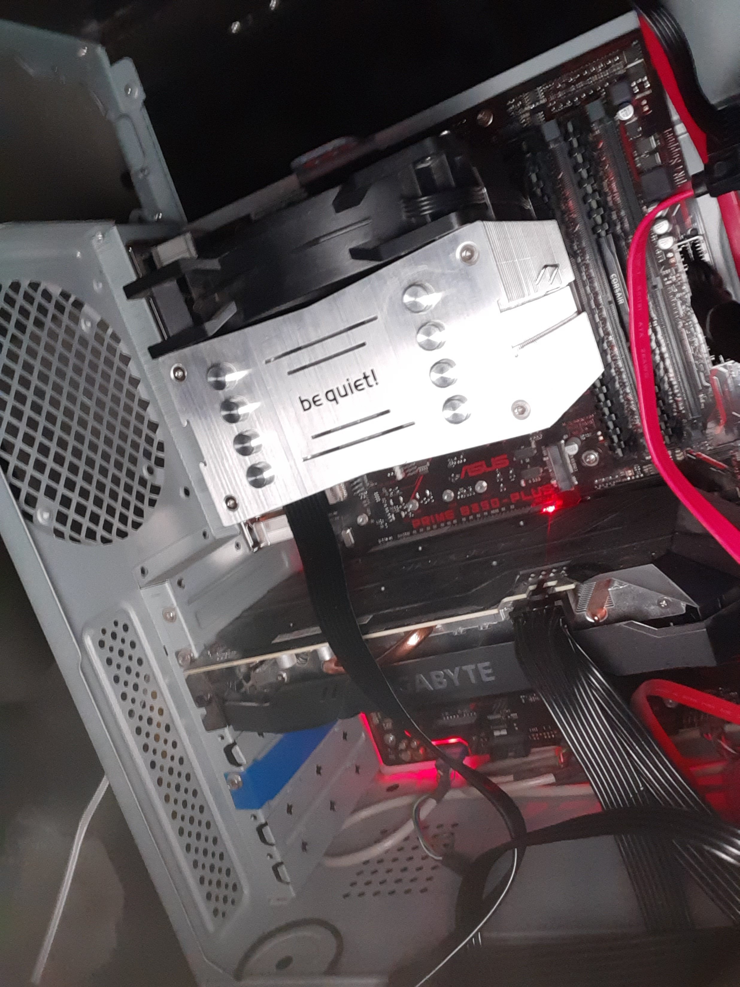 Der Kühler ist abenteuerlich montiert, dürfte aber ein alter Bequiet sein der sich auf dem Sockel nur verdreht aufbauen lässt. Momentan gibts einen schönen Hitzestau zwischen Kühler und Grafikkarte.