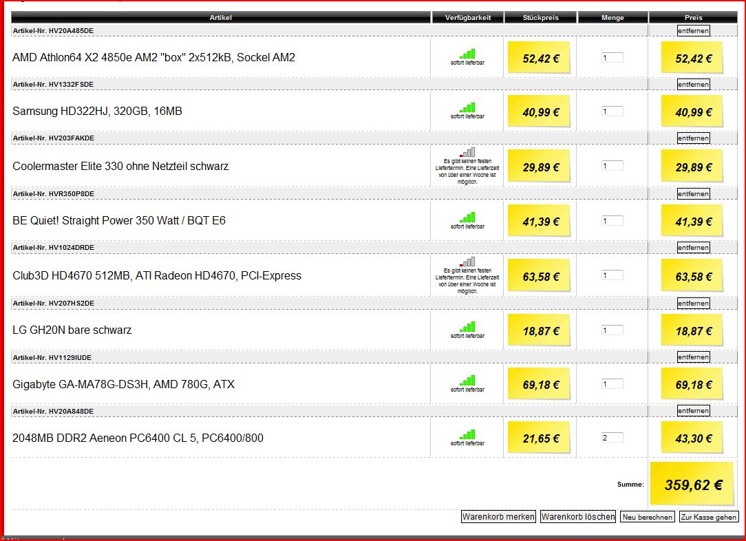 Vielleicht hat ja jemand in letzter Zeit irgendwo ein günstiges Angebot gesehen? Es muss auch kein Komplettsystem sein, ich halte mich auch für in der Lage den Rechner selber zusammen zu stecken, wenn ich dadurch günstiger komme..