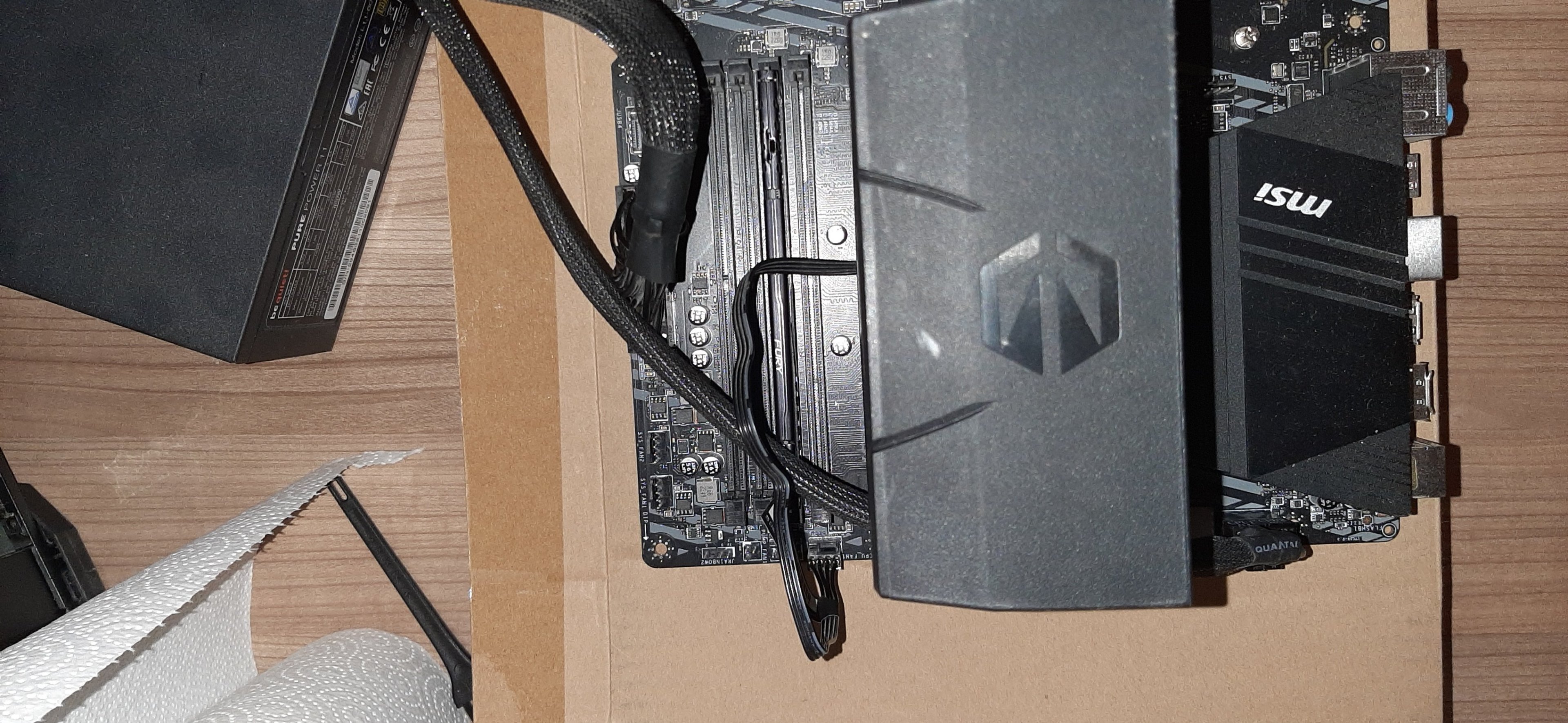4. Mainboard auf die Mainboardverpackung legen und nur CPU, 1 Ramriegel und Kühler und Netzteil anschließen und Testen.