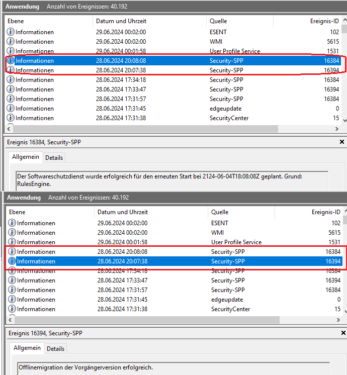 Trotzdem schreibt er in "Anwendung" noch zwei Einträge um 20:07:38 Uhr "Security-SPP - Offlinemigration der Vorgängerversion erfolgreich.", und um 20:08:08 Uhr "Security-SPP - Der Softwareschutzdienst wurde erfolgreich für den erneuten Start bei 2124-06-04T18:08:08Z geplant. Grund: RulesEngine.".