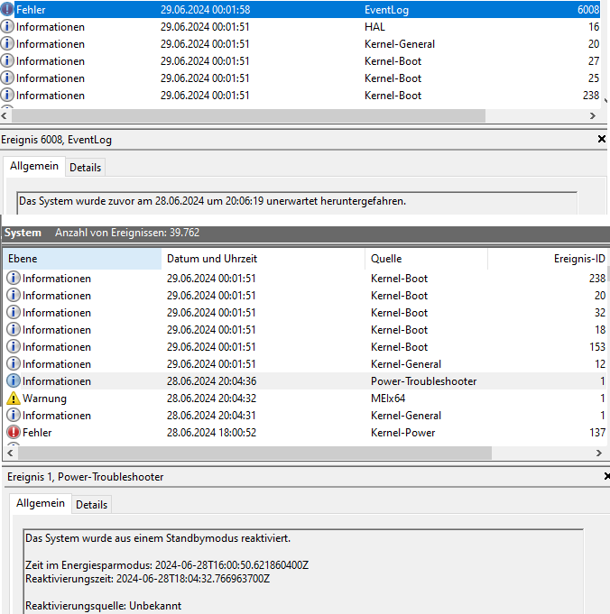 vorletzten Freitag, 28.06.24, hatte ich den PC eingeschaltet (um 20:04 Uhr aus dem Standby reaktiviert), um schnell eine Radio-Aufnahme mit RadioSure zu starten (20:05 Uhr), und dann weg zu gehen. Als ich vier Stunden später zurück kam, war der PC aus, und ließ sich auch erst wieder starten, nachdem ich das Netzteil mal kurz aus-, und wieder eingeschaltet hatte.