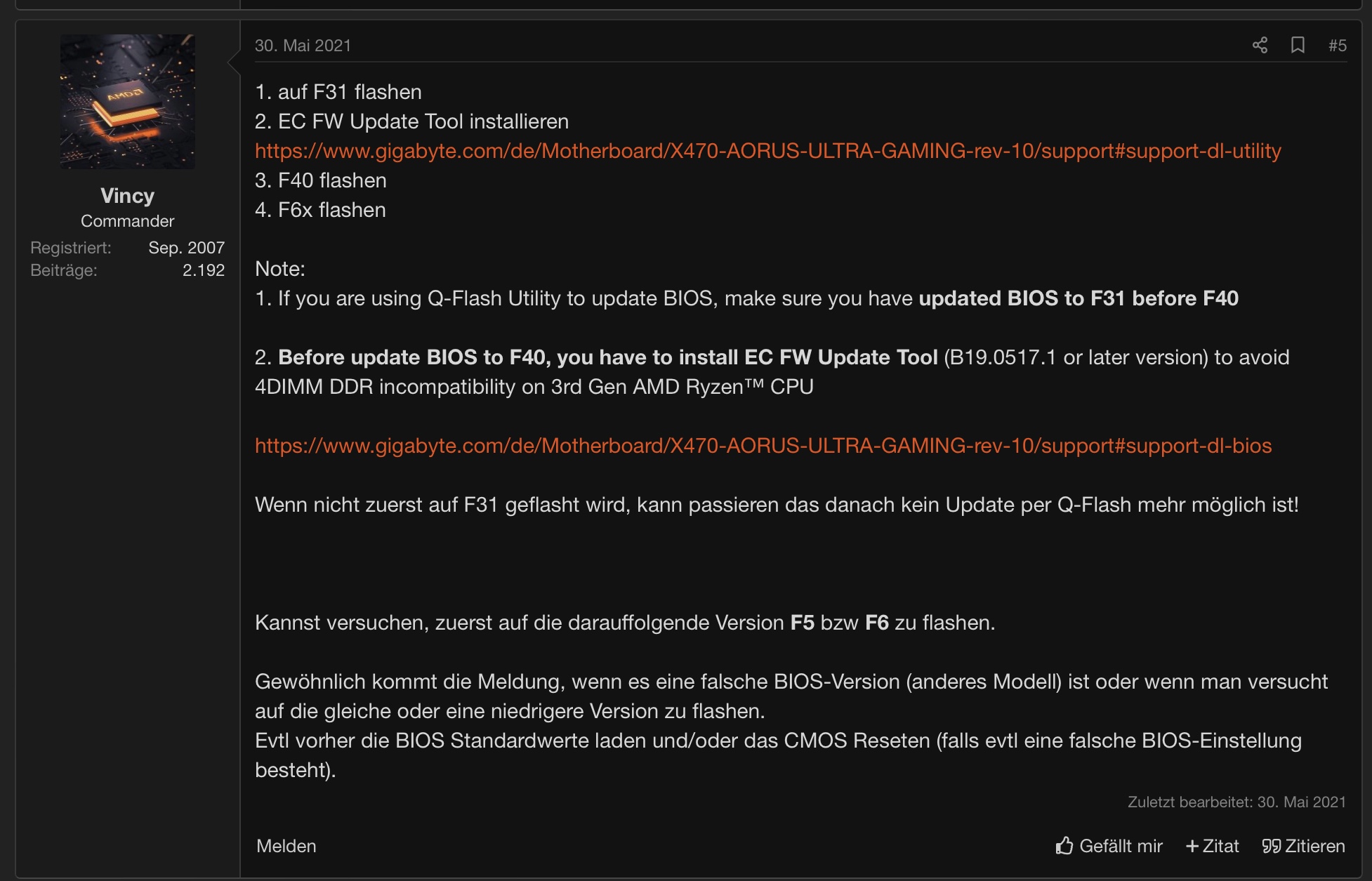 Ich möchte meine CPU erneuern (auf AMD Ryzen 9 5950X). Dafür muss ich mein BIOS von F2 auf F6x Updaten. Ich habe die Anleitung auf der Gigabyteseite (https://www.gigabyte.com/de/Motherboard/X470-AORUS-ULTRA-GAMING-rev-10/support#support-dl-bios) gelesen und habe gerade versucht erst mal von F2 auf F31 zu kommen (mit Q-Flash). Update hat vom USB-Stick geladen und nach dem automatischen Neustart komme ich über den Startbildschirm (Aorus mit den verschiedenen Angaben wie man ins BIOS etc. kommt) nicht hinaus.