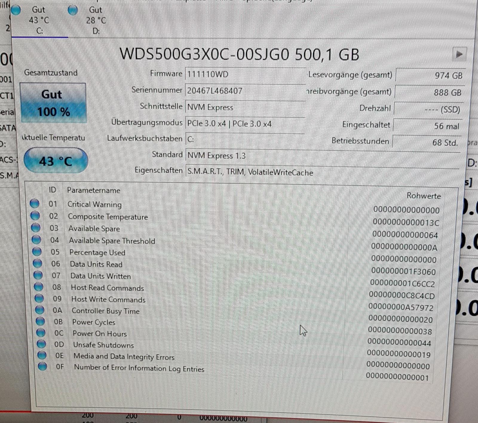 - SSD Festplatte mit CrystalDiskInfo getestet -> keine Fehler (siehe Bilder)
