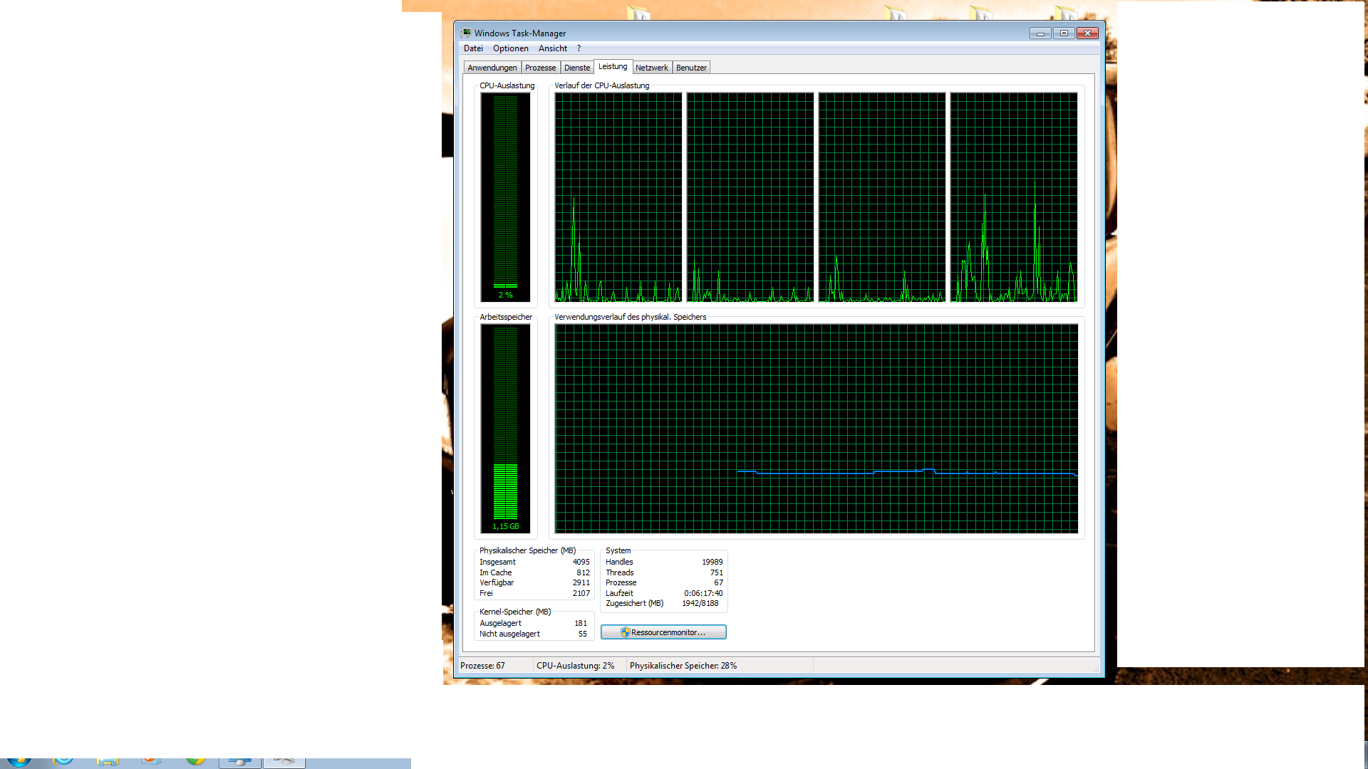 blöderidiot schrieb:Da liegt das Problem. Irgendein Programm, Prozess oder Tool macht etwas im Hintergrund, wofür es eine enorme Menge Speicher braucht. Prüfe mal bitte über den Systemmonitor von Windows, welche Programme Festplattenzugriffe machen und welche den meisten Hauptspeicher beanspruchen.
